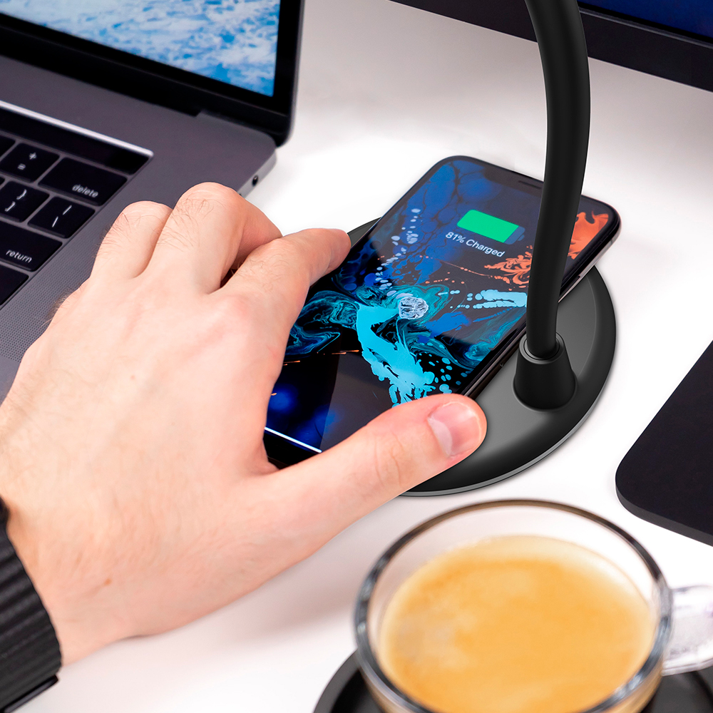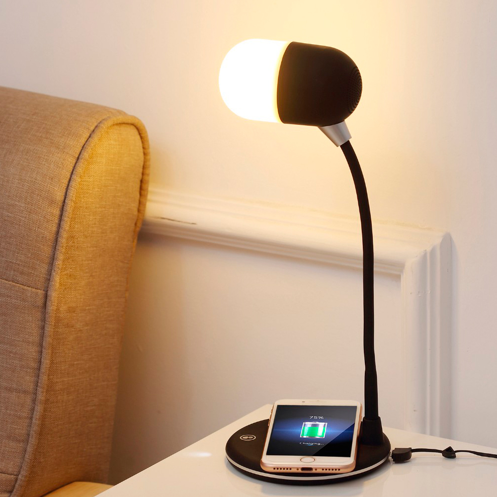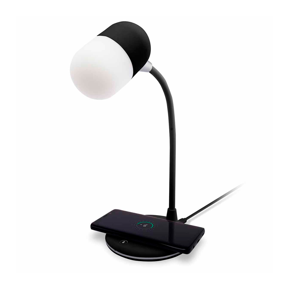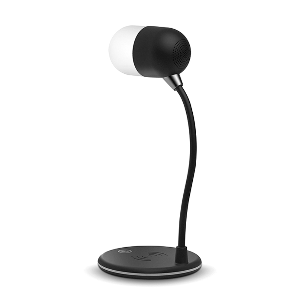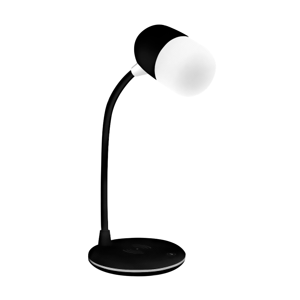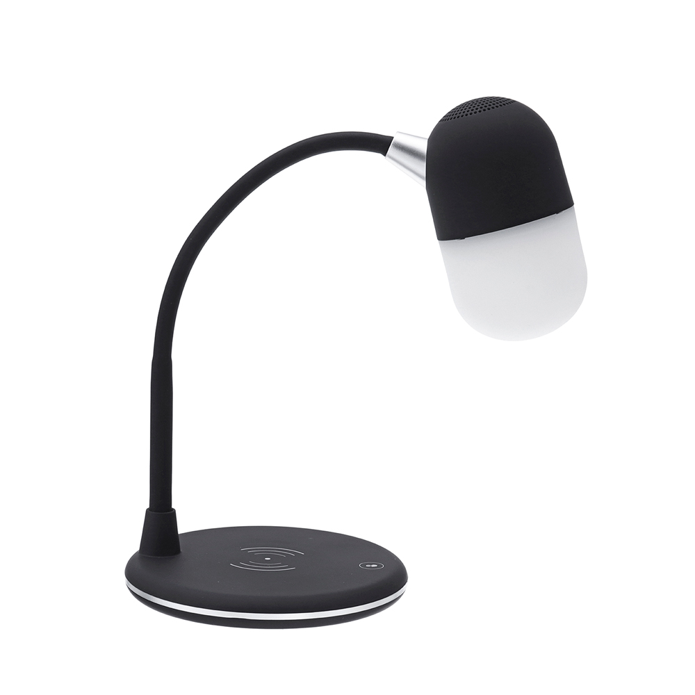 - Настольная лампа с колонкой и беспроводной зарядкой Alladin. Тип светодиодного индикатора: cветодиодная панель (яркость 28LM±2), три режима настройки света (яркий, теплый, холодный), 7 светодиодов. Мощность: 5 Вт. Максимальная мощность беспроводного зарядного устройства: 5/10 Вт (опционально). Мощность динамика: 3 Вт. Вход:5V/3A. Версия Bluetooth: V5.0. В комплекте кабель USB и инструкция.