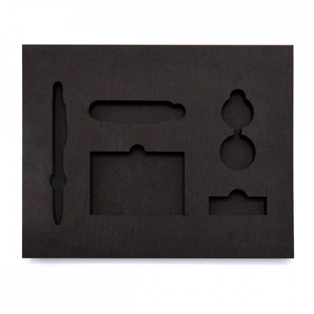 - Ложемент, выполненный из черного ЭВА материала, представляет собой многослойную конструкцию, состоящую из 3х слоев: нижнего толщиной 5 мм, среднего 10мм, и верхнего — 10 мм. Согласно утвержденному макету, проемы для размещения предметов могут быть расположены во всех 3 слоях. В стоимость входят все необходимые материалы и технологические процессы. Создание технического макета — отдельная услуга, которая оплачивается дополнительно, которую вы можете выбрать в калькуляторе карточки товара. Пожалуйста, прикрепите к заказу оригинал-макет в формате .pdf