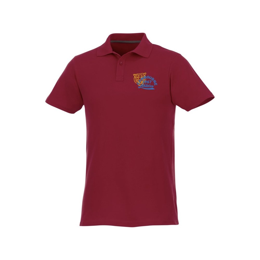 - Мужское поло Helios с коротким рукавом. Отрезной-отрывной ярлык для комфорта. Воротник гладкой вязкой в рубчик. Планка с двумя пуговицами. Двойная строчка на воротнике и внизу изделия. Пуговицы в цвет изделия. Полоска на горловине в контрастном цвете. Трикотаж Piqué, 100 % хлопок. 180 г/м².