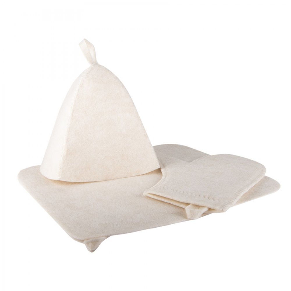 Расширенный классический набор для сауны из войлока– коврик, шапочка и рукавица из войлока. Коврик убережет от ожогов в сауне, шапочка предотвратит тепловой удар и не позволит высокой температуре и влажности испортить волосы, а рукавица не позволит вам обжечься паром.