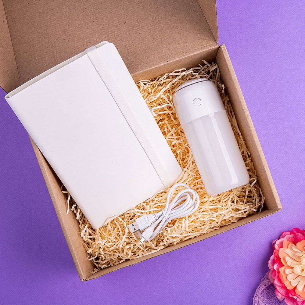 - В набор входят: арт. 346127 Увлажнитель FRESH ёмкость: 200 мл Элегантный декоративный увлажнитель со светодиодной подсветкой. Это незаменимая вещь в зимний период. Отопление сушит воздух, кожу и слизистые оболочки. Это вредит нашему здоровью и состоянию кожи. Увлажнитель поможет этого избежать. Нужно только не забывать доливать в него воду ;) Многоцветная подсветка. 2 режима увлажнения: непрерывный и интервальный Для использования в помещениях площадью до 25 м2. Запаснойм фильтр и кабель питания USB в комплекте. арт.21223 01 Бизнес-блокнот GRACY на резинке размер: 130х210 мм (формат А5) блок: кремовая бумага (блок 70 гр, форзац 160 гр), 192 стр., в линейку арт. 21024 Коробка подарочная Big BOX Размер: внутренний: 24*21*11 см, внешний: 25,5*21,5*11 см Она выполнена из бурого МГК, поставляется в плоском виде и легко собирается. МГК - это плотный бурый картон, который отлично вписывается в тренд крафтовой упаковки. Безопасный и экологически чистый материал. ВНИМАНИЕ! Набор поставляется в разобранном виде.