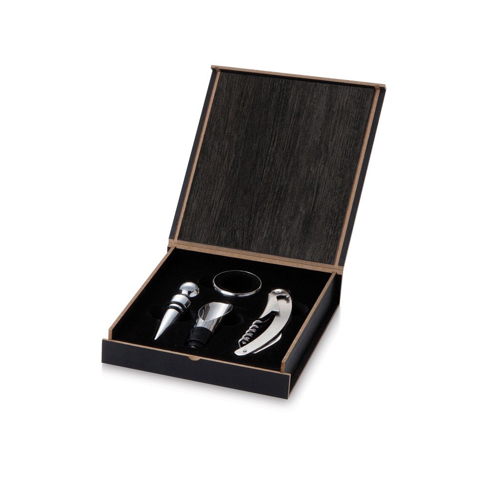 - Оригинальный подарок к любому празднику. Подарочный набор аксессуаров для вина в деревянной коробке порадует истинного ценителя. В наборе штопор, пробка, кольцо для бутылки и воронка-аэратор. На деревянную коробку можно нанести изображение по вашему эскизу.