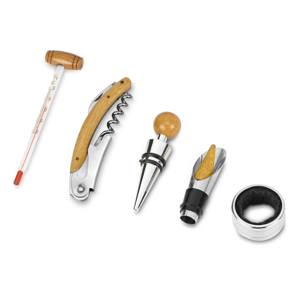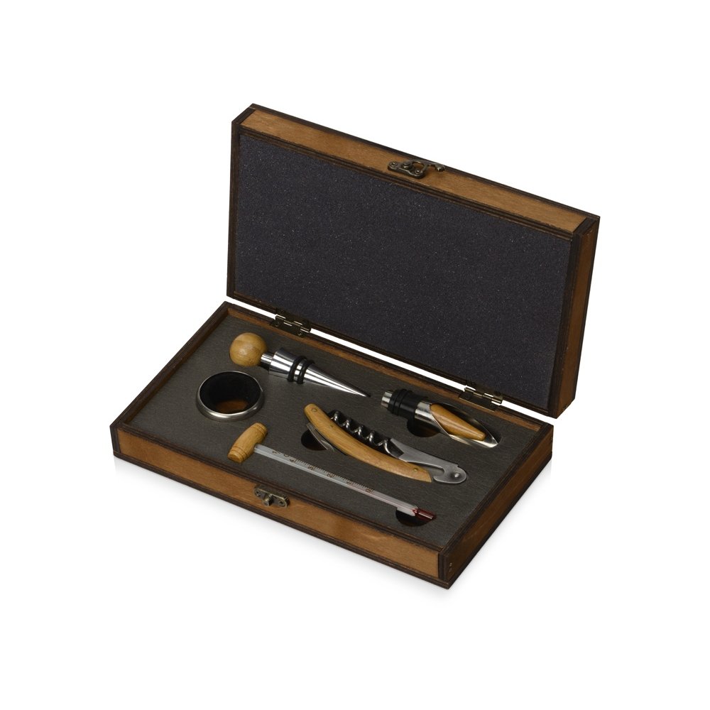 - Роскошный набор аксессуаров для вина Кот-де-Сезан – отличный подарок для истинных ценителей. В комплект входят воротничок на бутылку, воронка-аэратор, пробка для бутылки, штопор-открывалка, термометр. Упакованы в красивый деревянный футляр. Отличный вариант имиджевой продукции для ресторанов, гостиниц и винных магазинов.