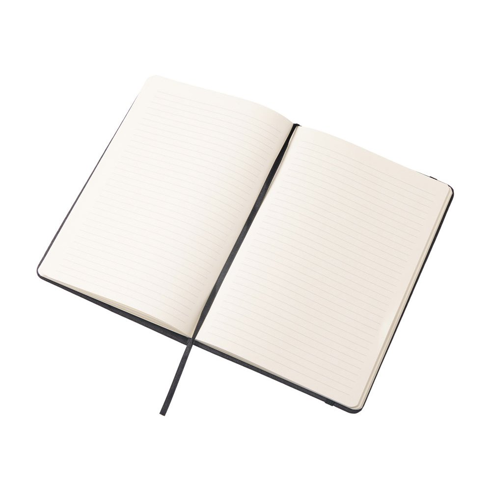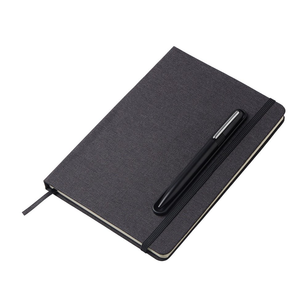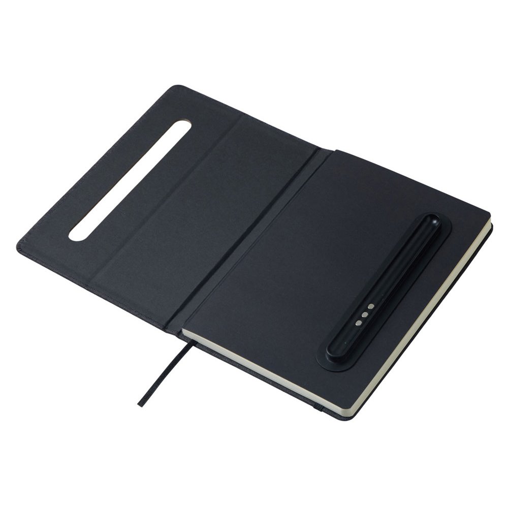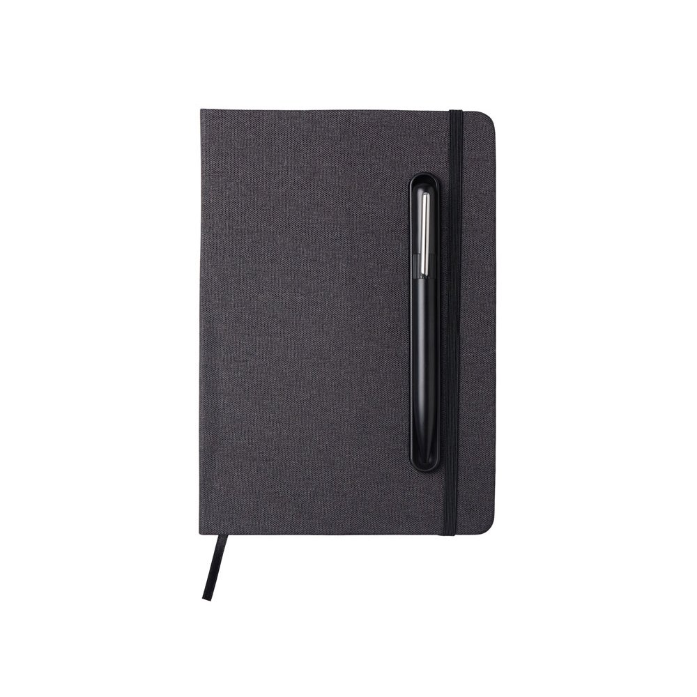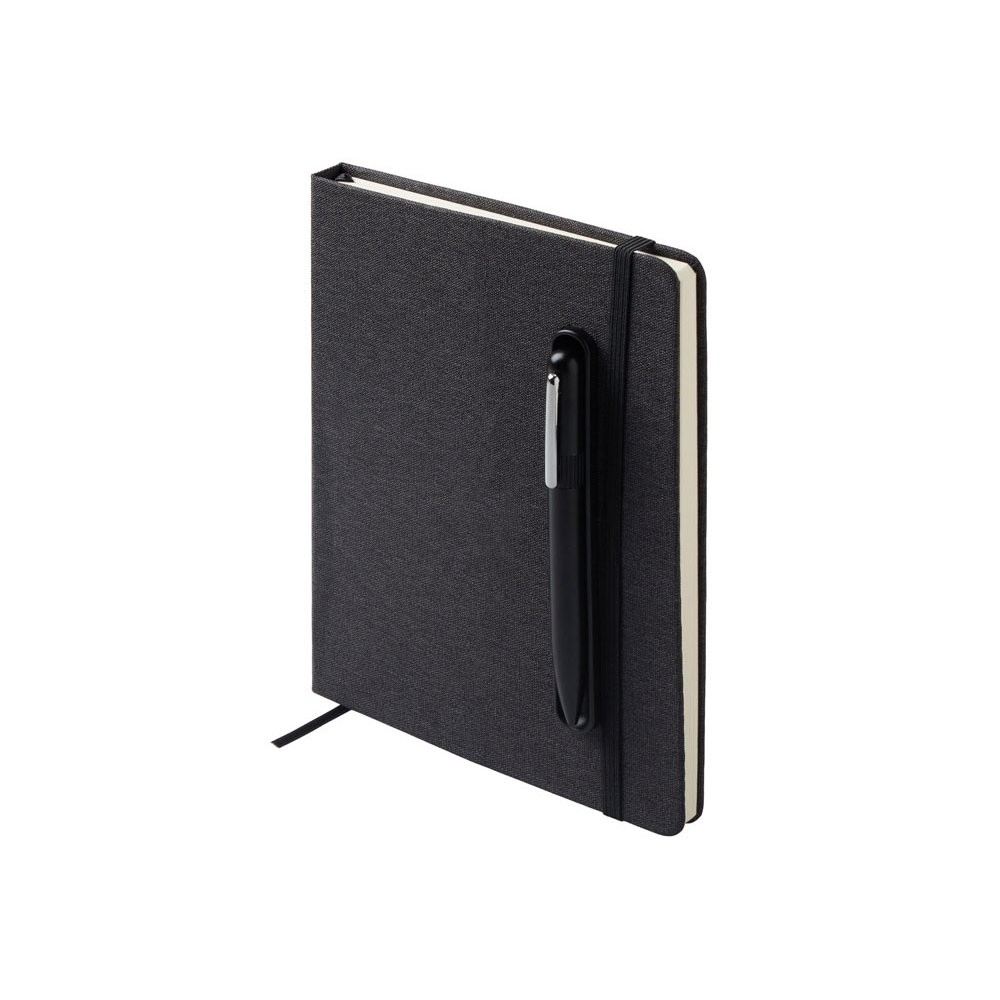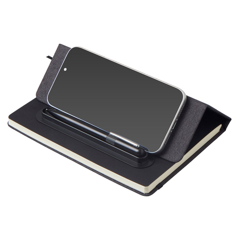 - Блокнот в твердой обложке из rpet-пластика с металлической шариковой ручкой. В обложке магнитный держатель для ручки. Также верхняя часть обложки трансформируется в подставку для телефона. В блокноте 80 листов бумаги 70 г/м2.