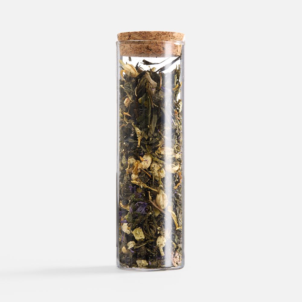 - чай зеленый «Восемь сокровищ Шаолиня» (состав: сенча, зеленый чай ганпаудер, папайя, лепестки сафлора, лепестки календулы, ароматизатор «клубника»), вес 25 г;