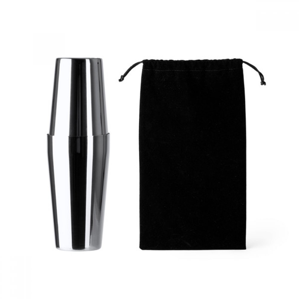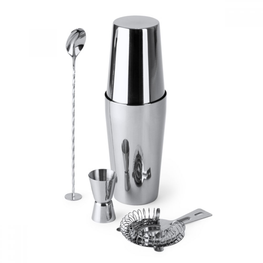 - Набор для коктейлей из нержавеющей стали. Включает мерный стакан, шейкер объемом 580 мл, ситечко и ложку. В комплект входит сумка для переноски.