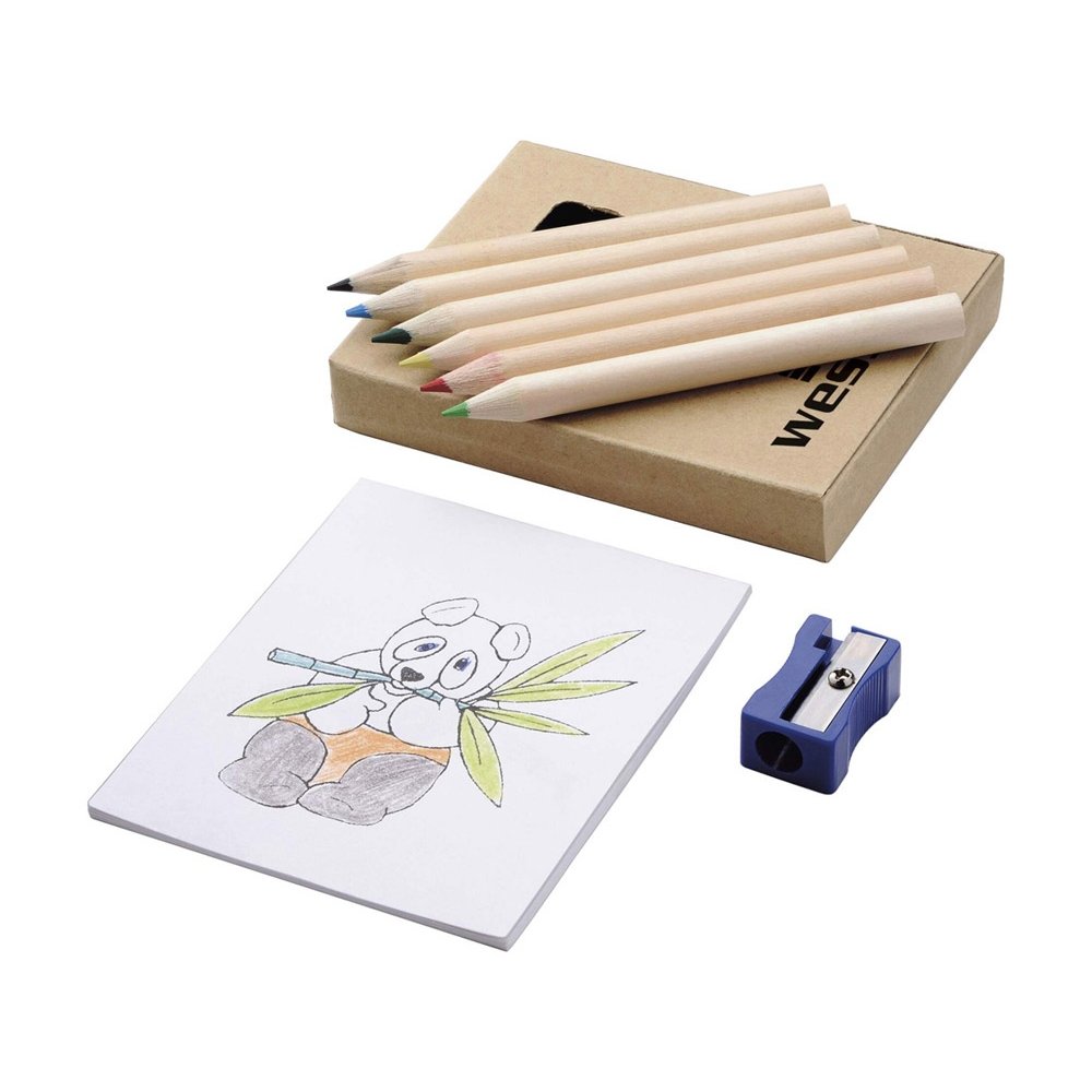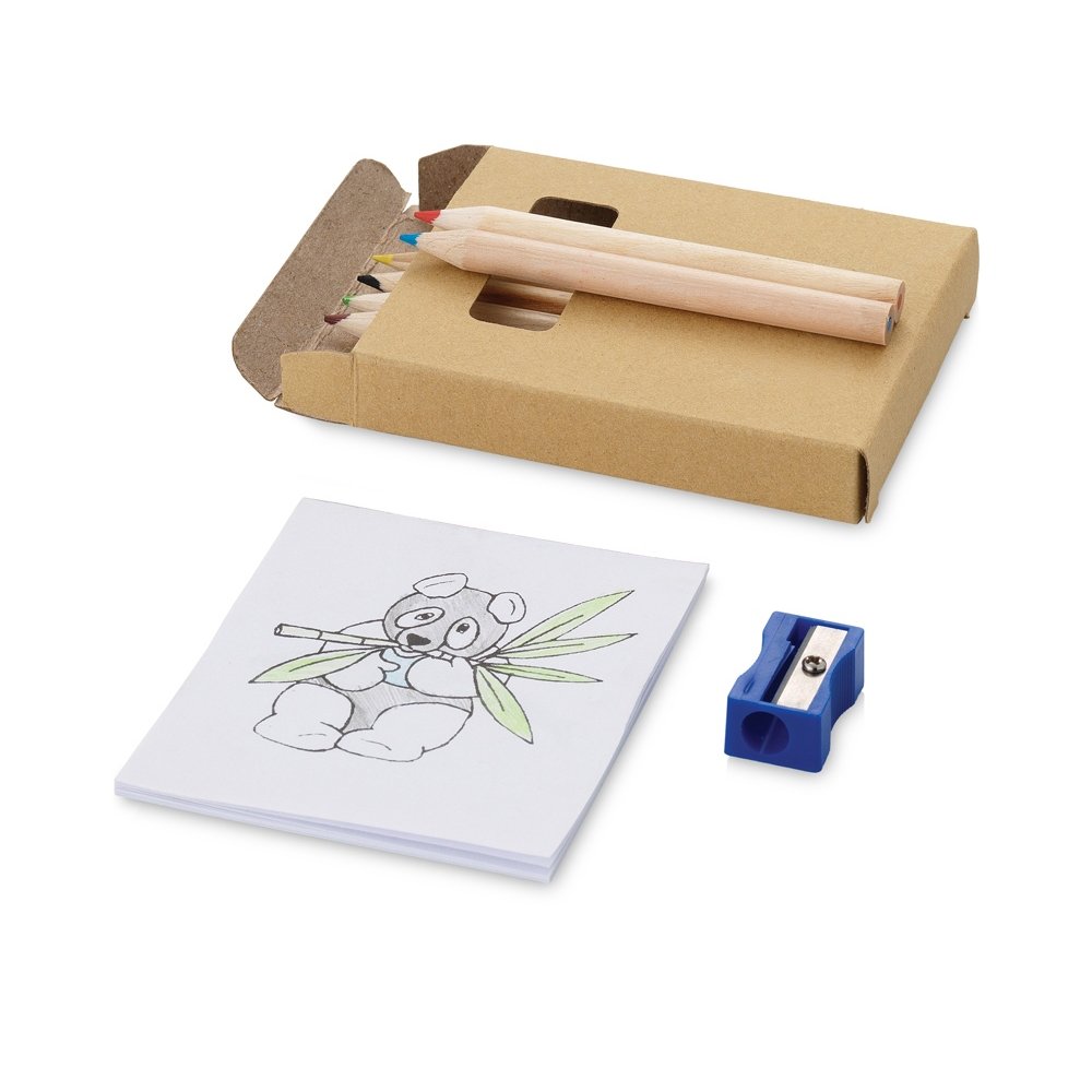 - Оригинальный набор для рисования будет отличным промо-сувениром для любой акции креативного направления. Также отлично подойдет для продвижения дизайнерской студии. В наборе 6 цветных карандашей, точилка и раскраска. Комплект упакован в картонную коробку.