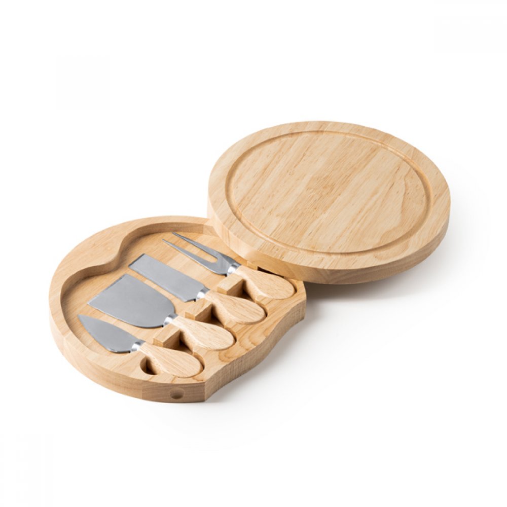 - Набор для сыра с 4 приборами из нержавеющей стали с деревянной ручкой. Представлен в практичном деревянном футляре с разделочной доской на верхней поверхности. Представлен в белой коробке