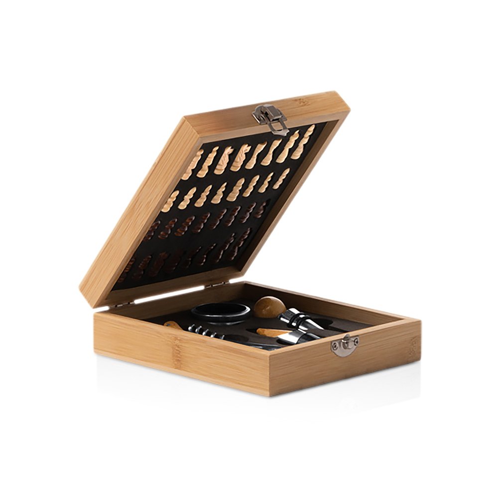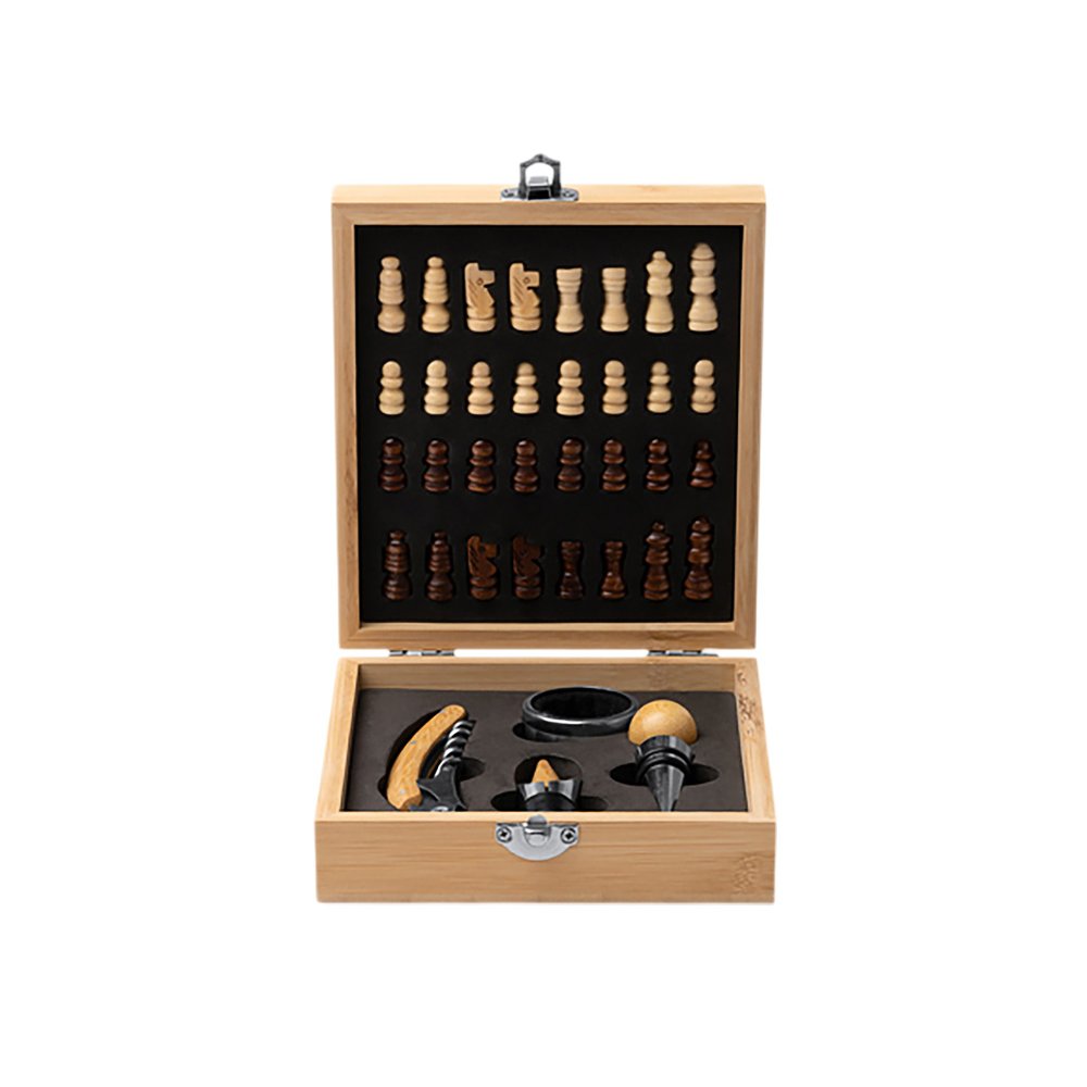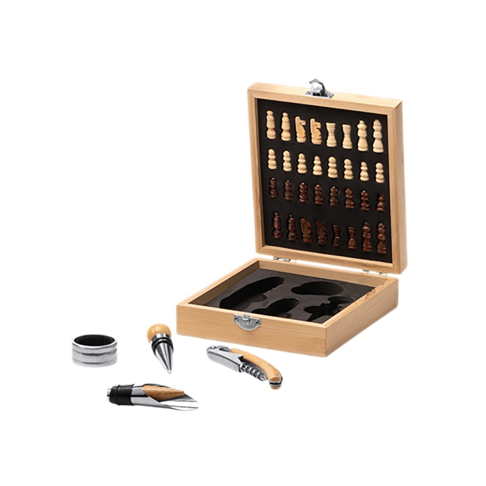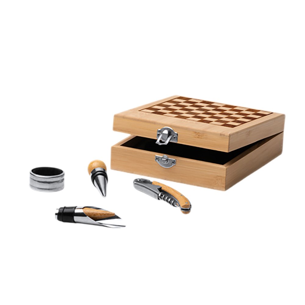 - Винный набор с аксессуарами из нержавеющей стали и бамбука. Представлен в бамбуковом футляре с шахматным рисунком. Мягкая внутренняя отделка. В комплекте игровые фишки и 4 аксессуара: штопор, дозатор, крышка и кольцо для сбора капель. Поставляется в экологичной дизайнерской коробке.