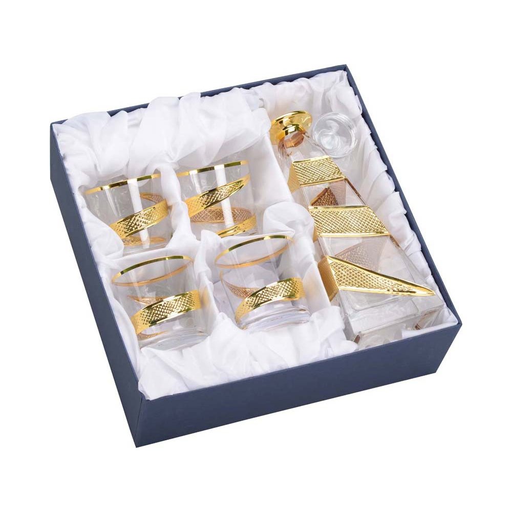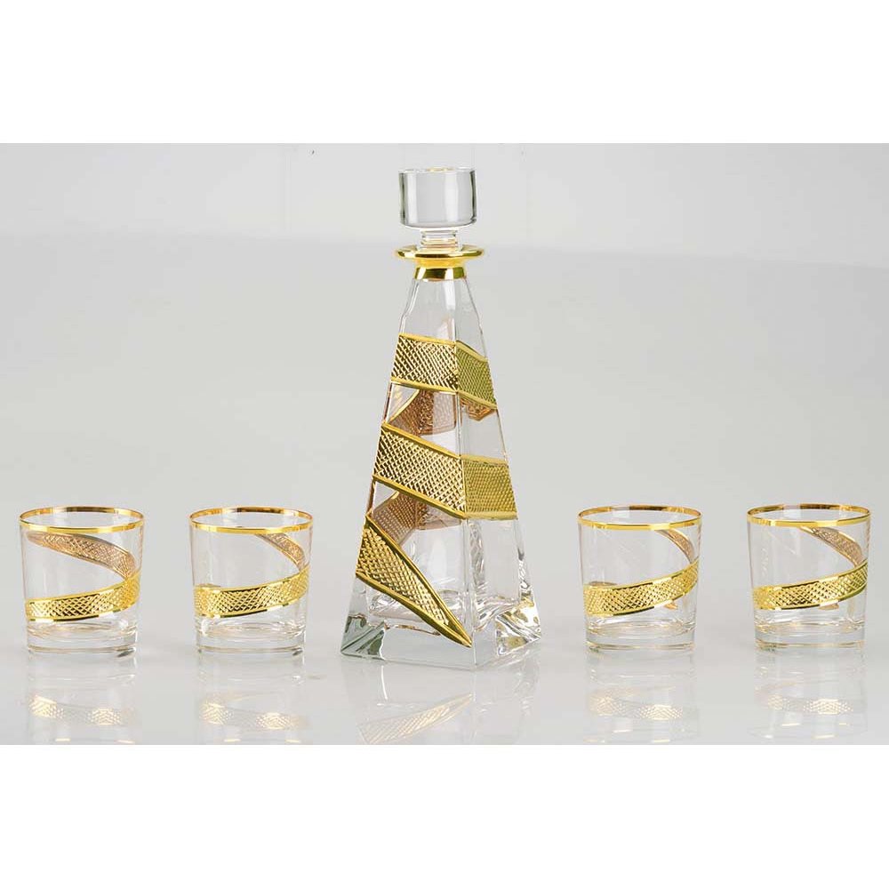 - Набор для виски состоит из графина пирамидальной формы и 4 бокалов. Набор выполнен из тонкого хрусталя, украшенного позолотой. Графин станет непременным атрибутом неформальной встречи с ключевыми партнерами.