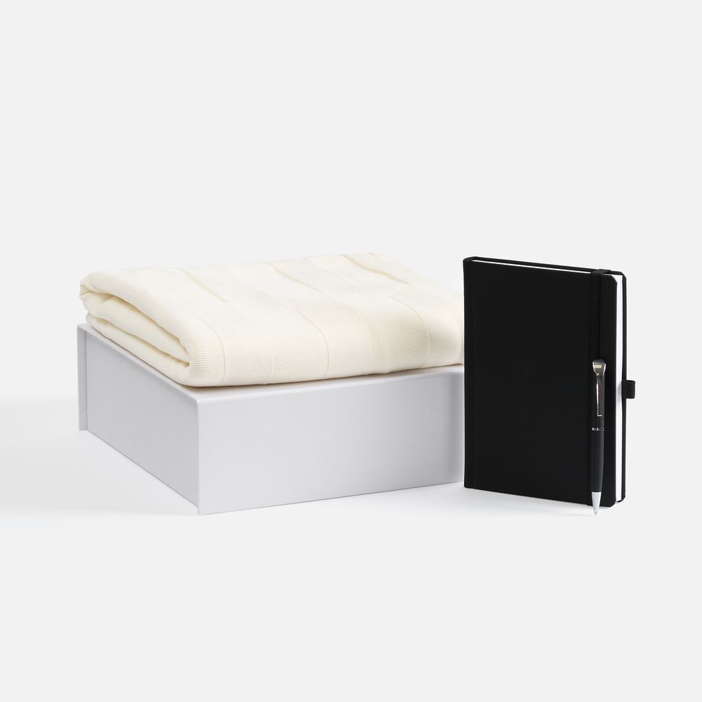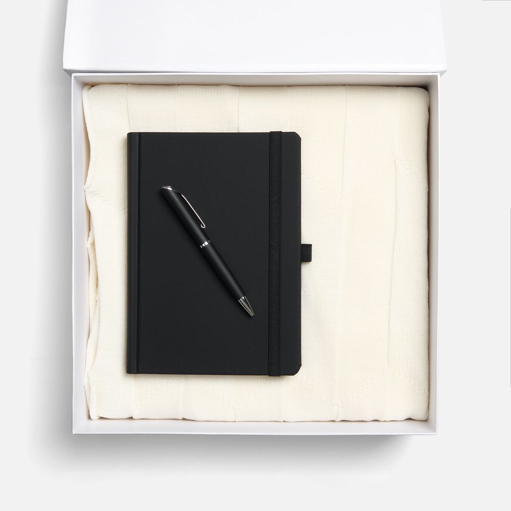 - Однотонный набор с основной канцелярией и пледом — классика жанра в уютном исполнении. С компактным ежедневником будет удобно делать заметки в любое время — благодаря петельке для ручки любимый пишущий инструмент будет всегда под рукой. А изысканный акриловый плед с геометрическим узором позволит выразить самые теплые пожелания и ддобавит плавных линий в интерьер.