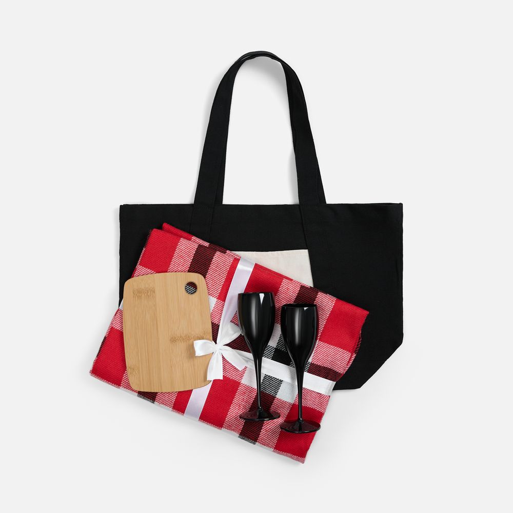- Этот стильный и лаконичный набор для пикника собрал все необходимое для комфортной и уютной вылазки на природу — теплый яркий плед, 2 бокала для шампанского и миниатюрную доску для нарезки и подачи любимых закусок. Все это легко помещается в стильный шопер.