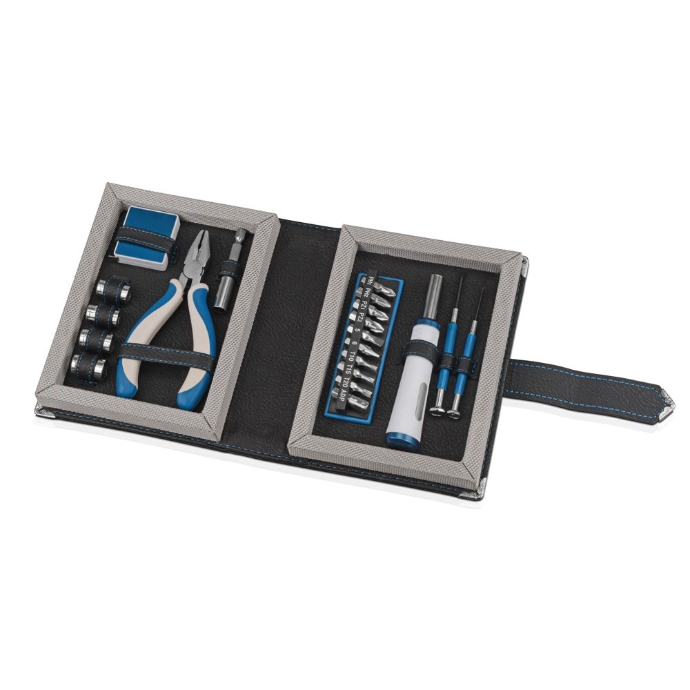 - Полезный набор инструментов, состоящий из 20 предметов, компактно размещается в футляре из кожзаменителя в виде книги. Набор можно возить в машине, брать с собой на дачу, ведь он не займет много места.