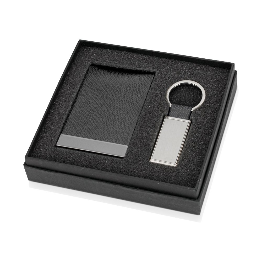 - Визитница из кожзаменителя и металлический брелок прямоугольной формы - идеальный тандем из бизнес-атрибутов, которые всегда дополнят образ делового человека и принесут ему пользу. Набор можно персонализировать методом гравировки.