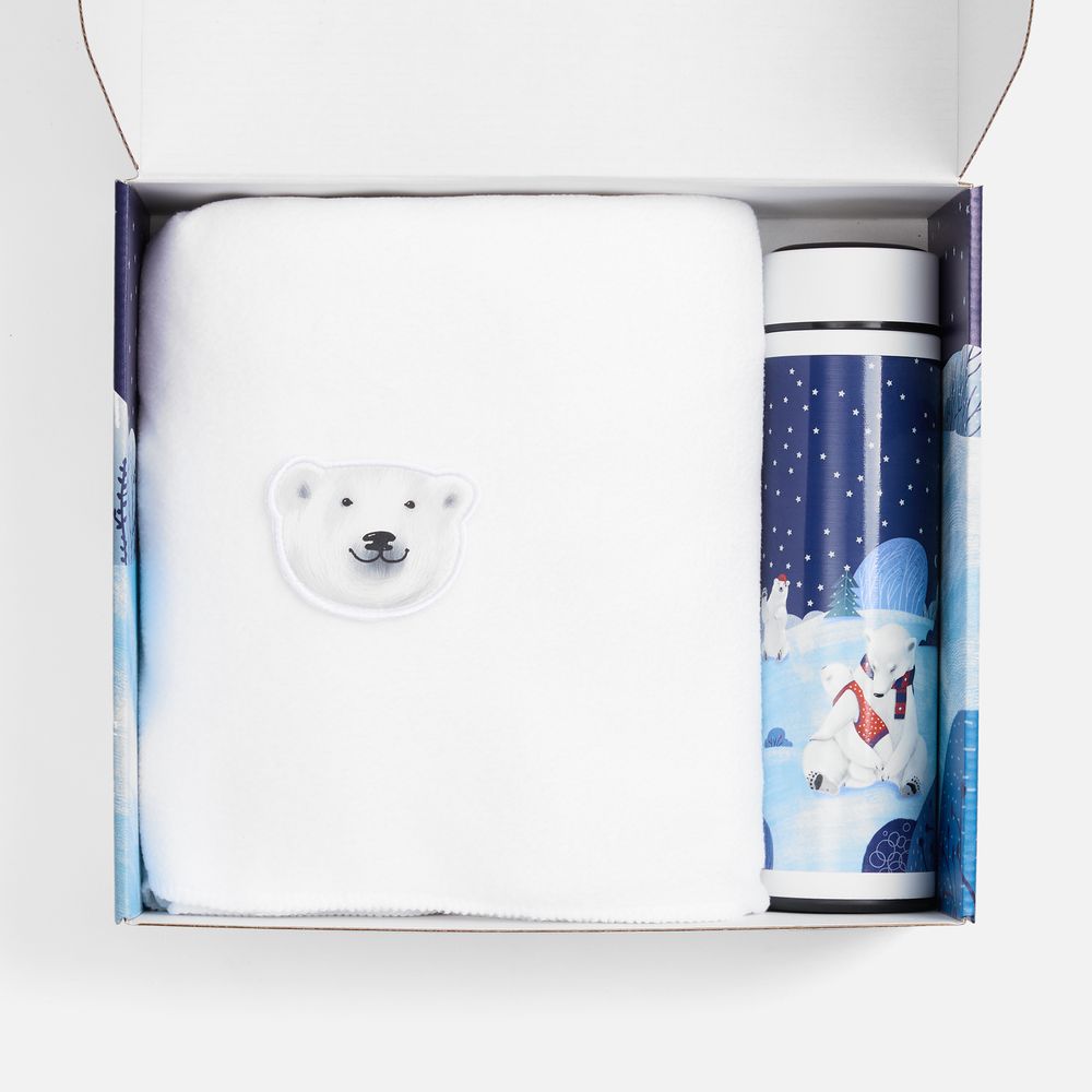- «Мишкин очаг» — это теплое объятие зимнего уюта в красочной подарочной упаковке. Здесь практичность встречается с волшебством: белый флисовый плед, словно припудренный первым снегом, в компании с лаконичным термосом поможет поддержать внутреннее тепло.