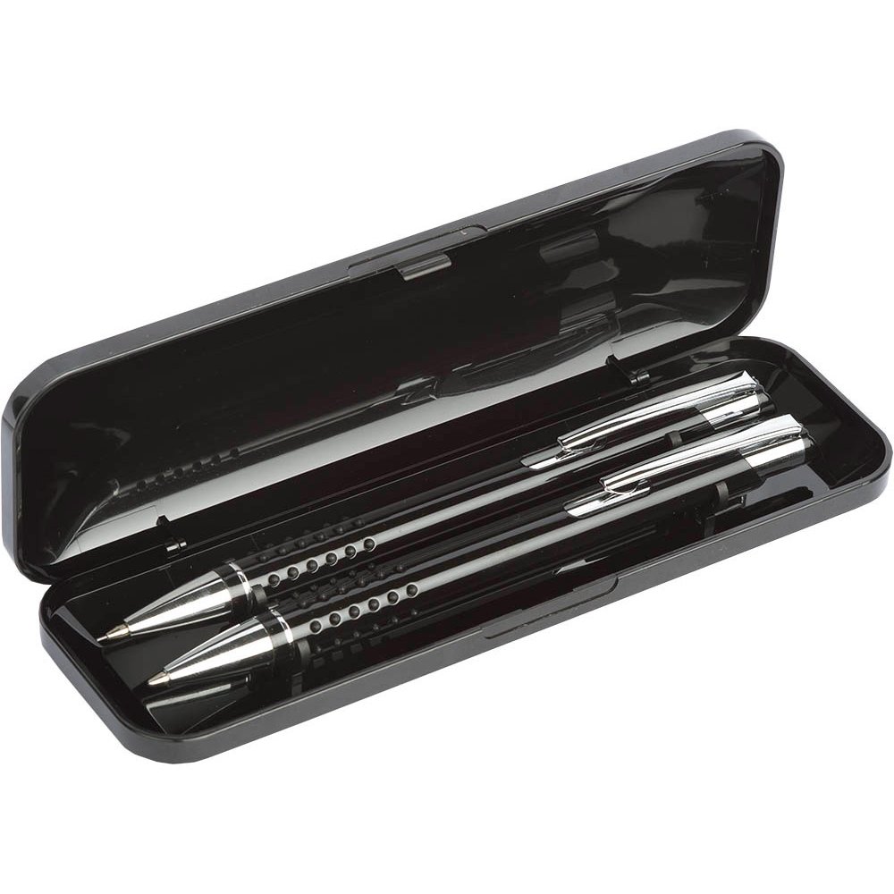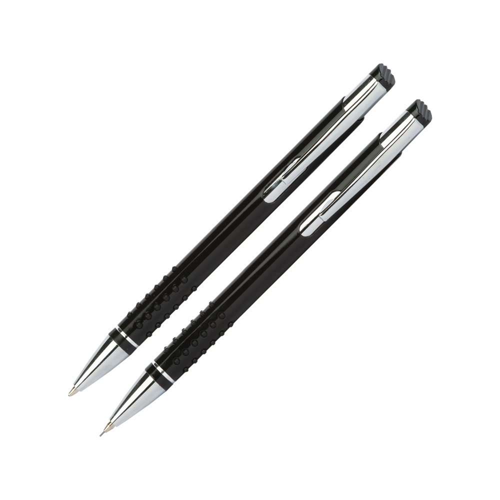 - Набор письменных принадлежностей, состоящий из шариковой ручки с нажимным механизмом и механического карандаша, предлагается в компактном пластиковом футляре. На ручку, карандаш и футляр можно нанести логотип и подарить в качестве сувенира или небольшого презента клиенту компании.