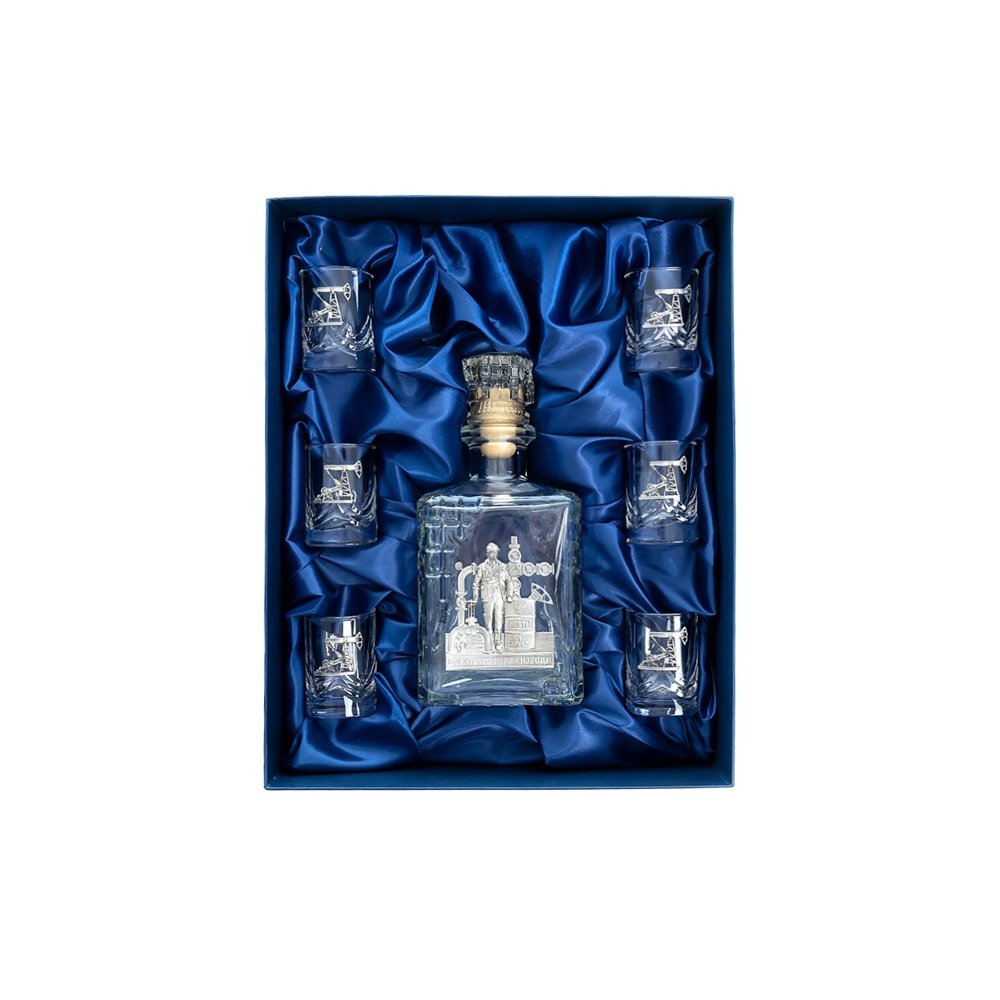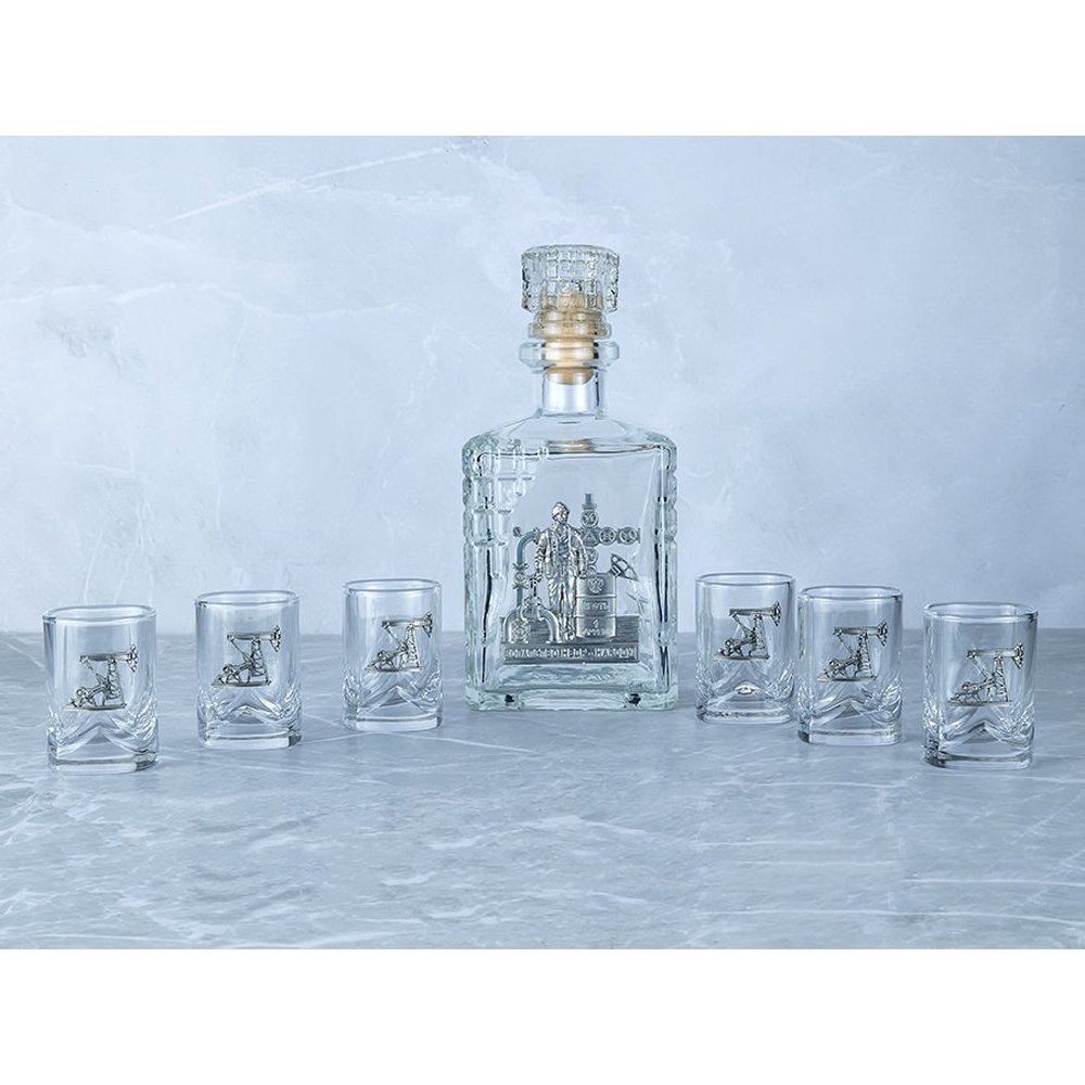 - Подарочный набор со штофом «Нефтяной». Традиционная для русского человека комплектация: элегантный графин емкостью 750 мл. с оловянным барельефом «Нефтяник» и 6 стопок емкостью 50 мл. с оловянным барельефом «Нефтяная вышка». Материал барельефов: сплав с содержанием олова не менее 95%(пьютер). Художественное литье,чернение с эффектом антикварного серебра, полировка. Ручная работа. Подарочная упаковка «люкс» с атласным ложементом.