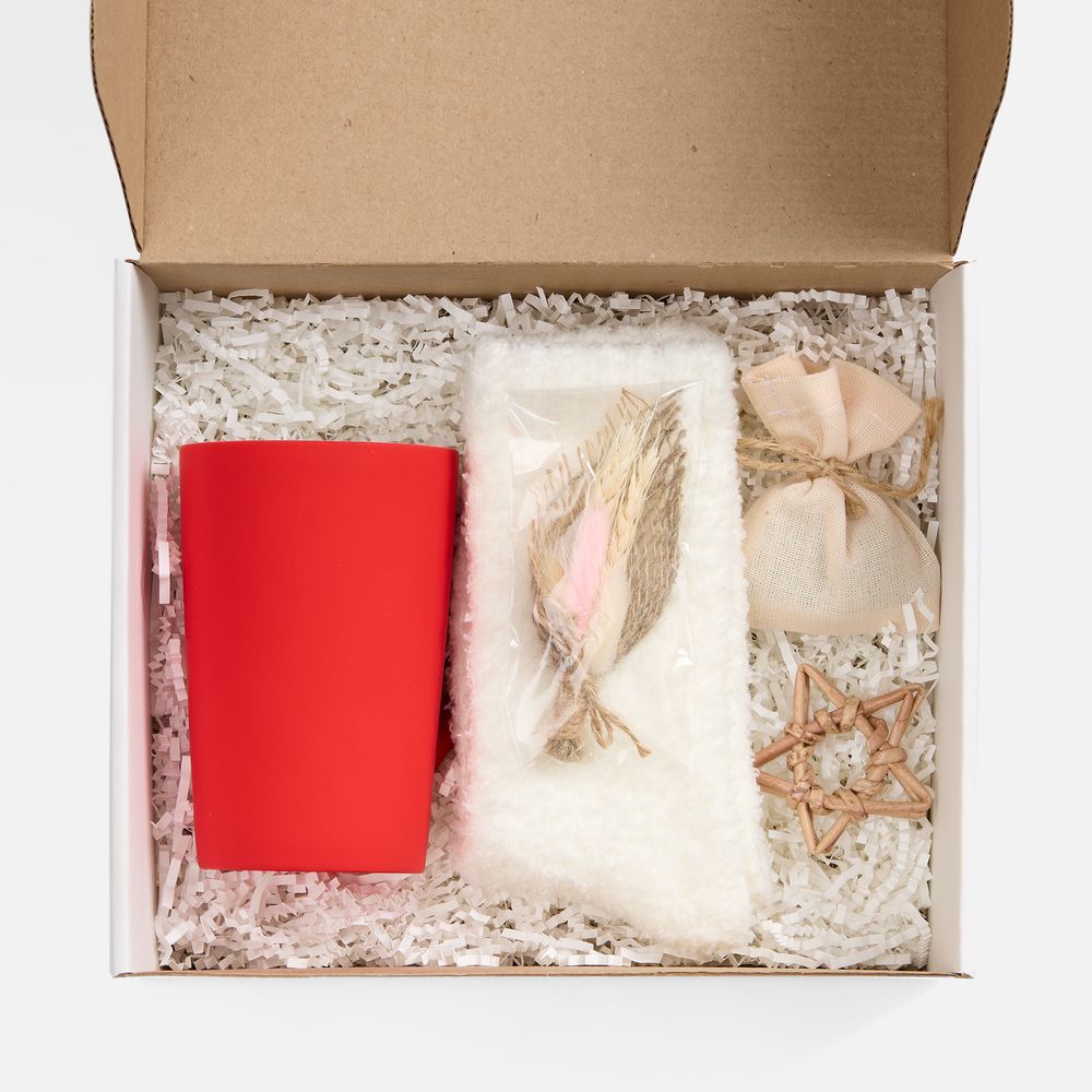 В изящной коробке — лаконичный дуэт, созданный исключительно для комфорта и спокойных мгновений: софт-тач кружка для любимых напитков и мягкие пушистые носки для полного расслабления.