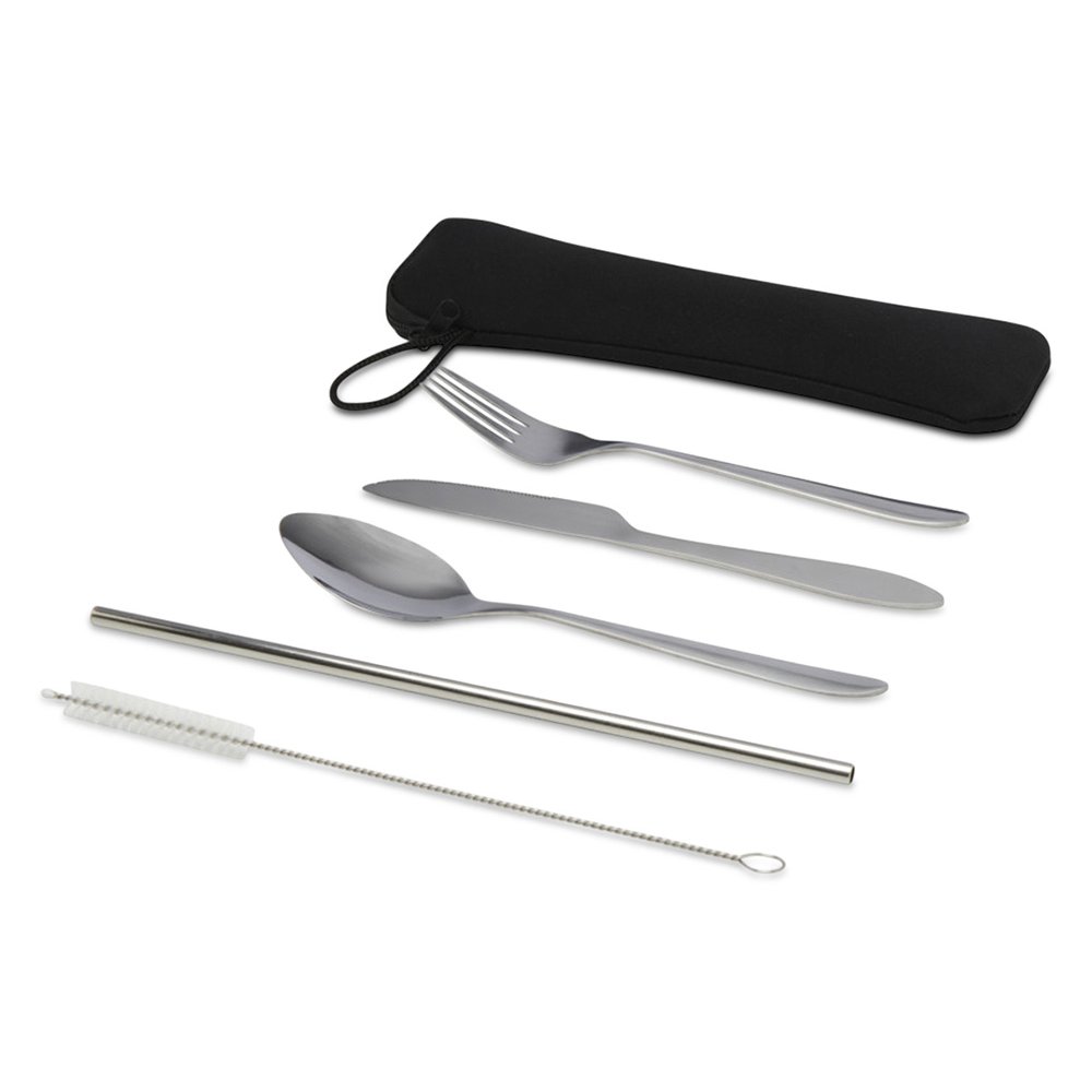 - Набор столовых приборов "Sheen" включает вилку, нож, ложку, многоразовую соломинку и щёточку для её очистки. Все элементы выполнены из прочной и легко моющейся нержавеющей стали. Комплект удобно хранить и переносить в прочном чехле из неопрена с удобной петлей.