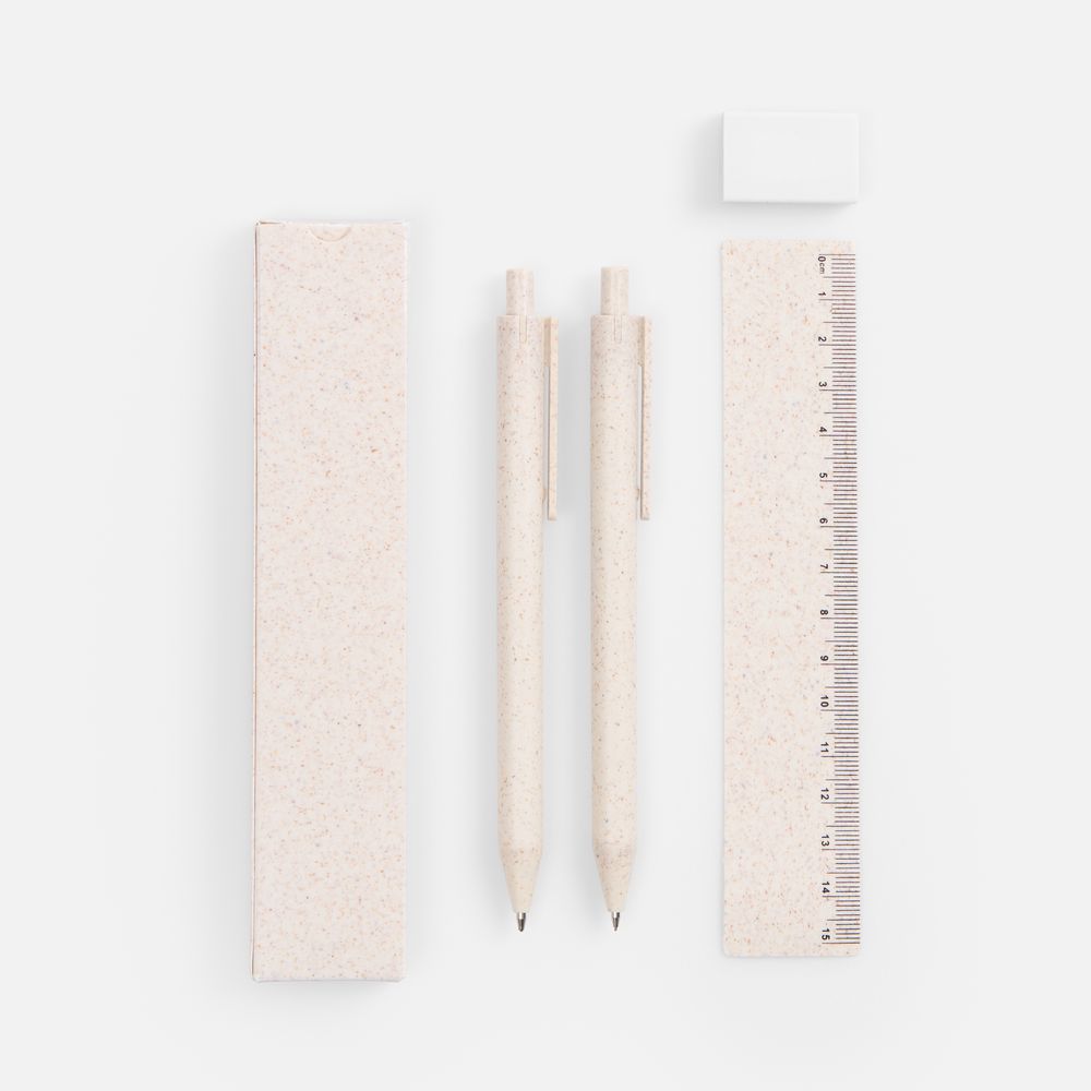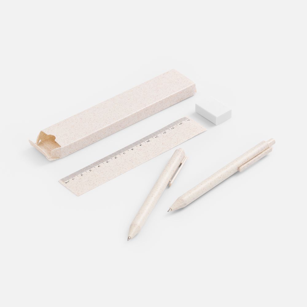 Ручка, механический карандаш, ластик и линейка в коробочке, которая в дальнейшем может служить компактным пеналом.- В комплекте ручка, механический карандаш, линейка, ластик и упаковка.