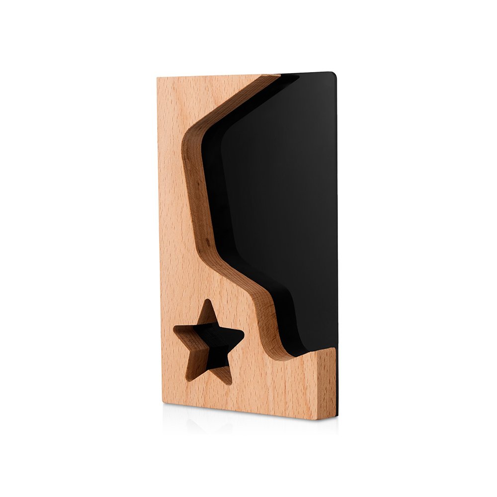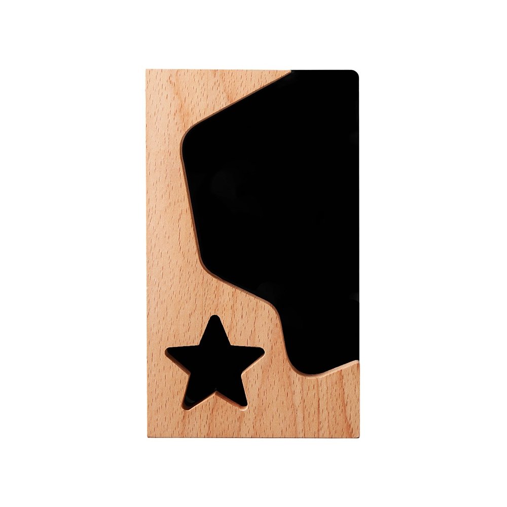 - Красивая и современная награда для главных звезд любой компании. Черный акрил добавляет контраста рамке из бука, логотип или наградную надпись можно выгравировать на деревянной части или сделать уникальный дизайн, благодаря полной запечатке акрила методом УФ-печати.