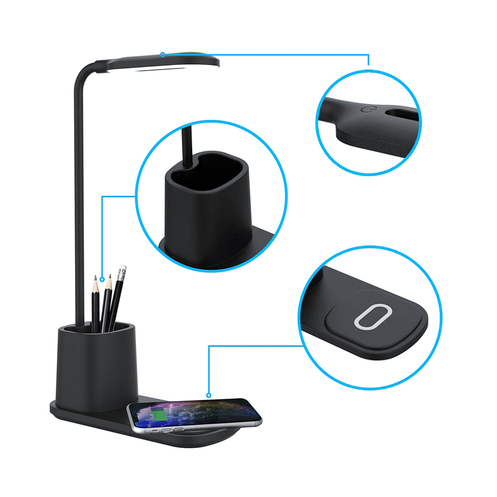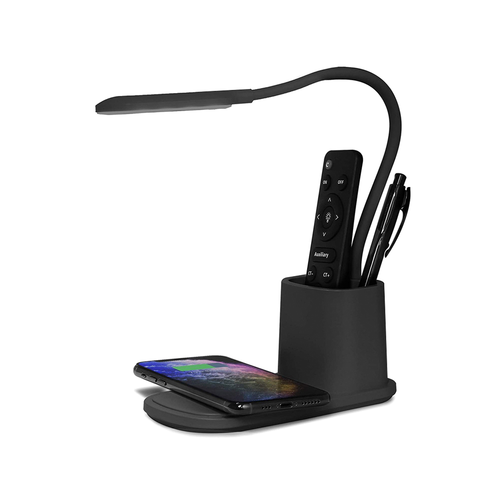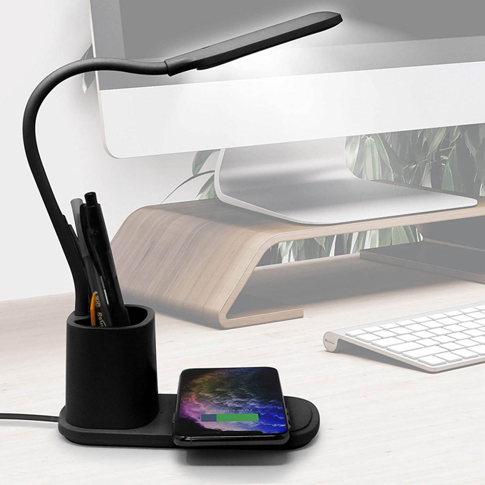 Практичная настольная лампа Tenza для использования в офисе и доме. Стильный лаконичный дизайн и гибкое поворотное регулирование лампы удобно в использовании как на офисном столе, так и прикроватной тумбе. Возможность выбирать степень яркости света несомненный плюс. Держатель для ручек дополняет функциональность. И безусловный лидер популярности – это функция беспроводной зарядки Qi. Тип лампы LED (0.5 x 20 световых диодов. Цветовая температура 3000-6000К). Беспроводная зарядка 10W. Питание: 5V/2A / 100~240V/50-60Hz. В комплекте кабель USB и инструкция.