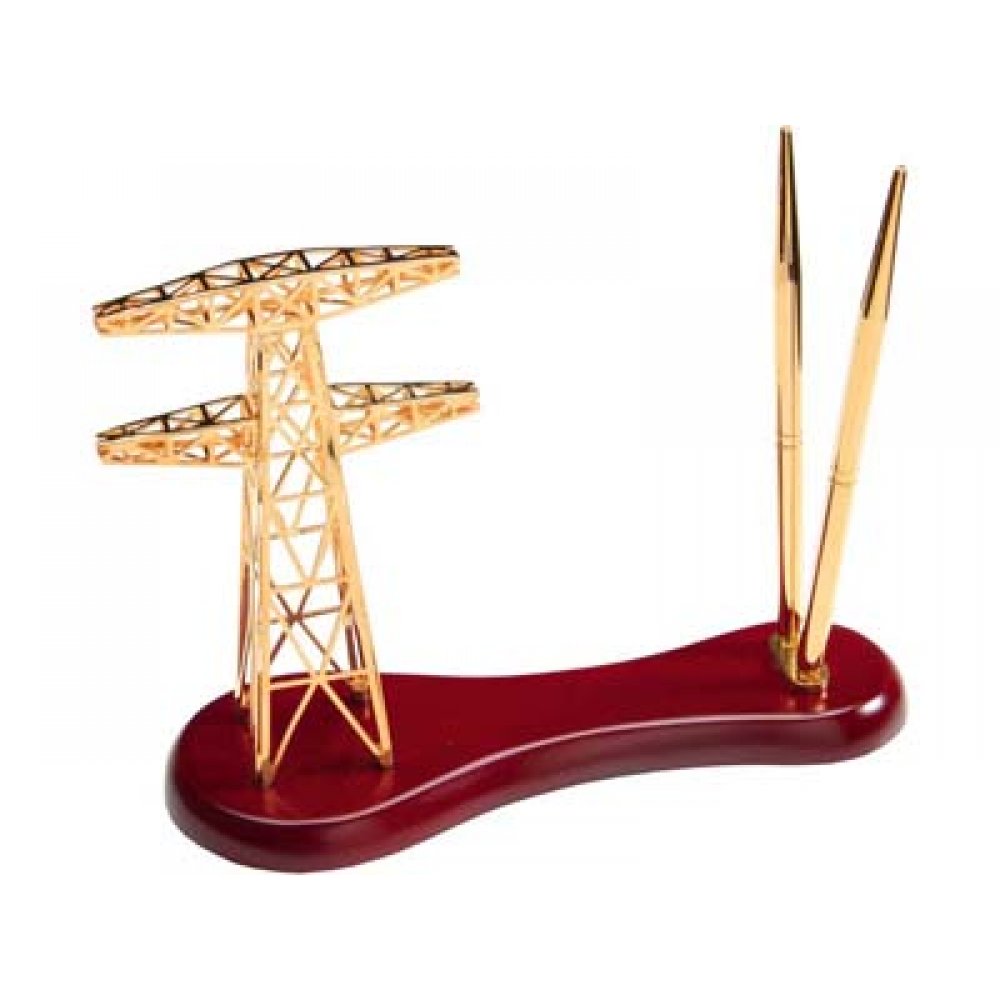 - Настольный набор состоит из двух ручек золотистого цвета, размещенных на подставке, и фигурки высоковольтного столба ЛЭП. Такой тематический подарок отлично подойдет для руководителей или сотрудников энергетических компаний и станет оригинальным украшением рабочего стола.