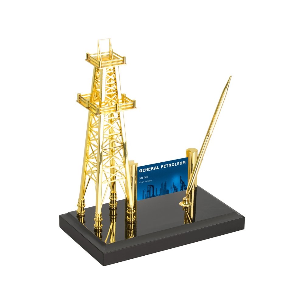 - Настольный прибор с вышкой прекрасно подчеркнет специфику работы ресурсодобывающей компании. На приборе расположена визитница и подставка для шариковой ручки. Классическое сочетание черного и золотистого оттенков хорошо впишутся в интерьер.