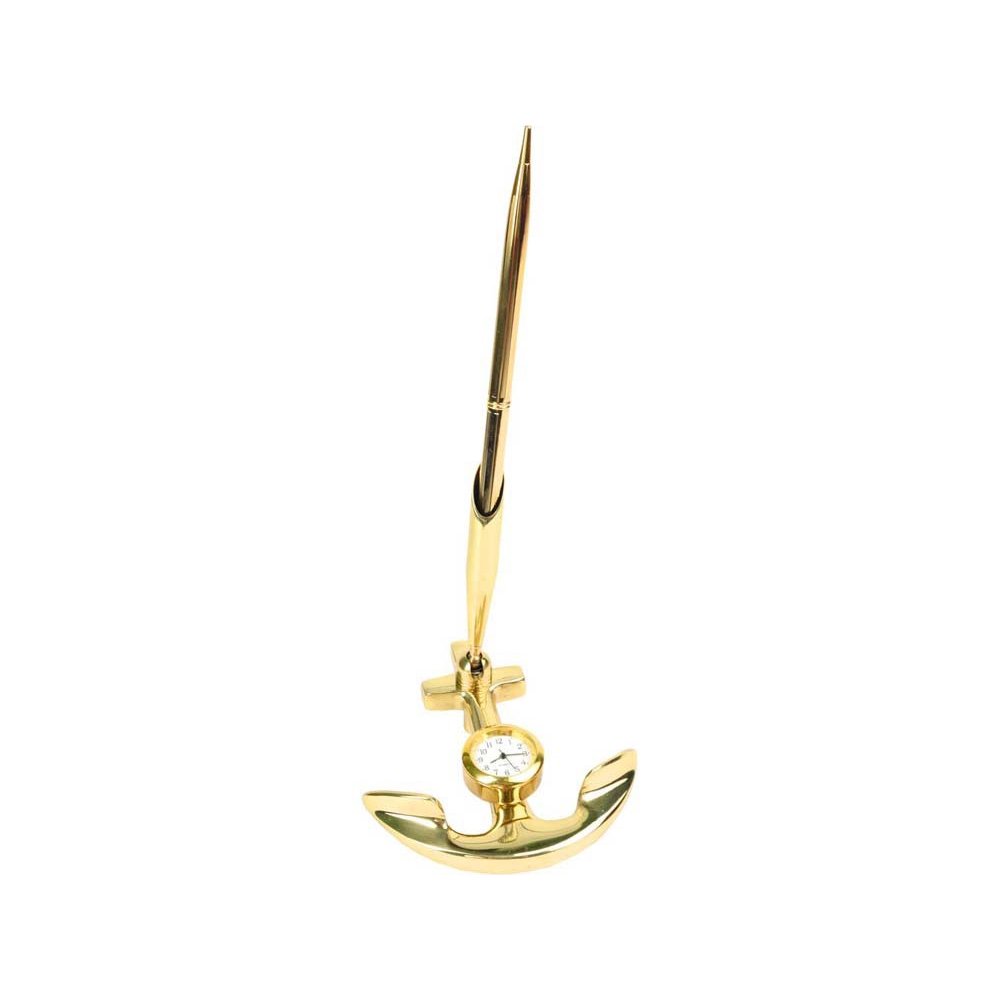 - Небольшой настольный прибор в форме якоря оборудован подставкой для ручки и часами. Прибор сделан из латуни и обладает стильной золотистой расцветкой. Прибор идеально подойдет в качестве подарка представителям судоходных компаний, а также любителям рыбалки и моря.