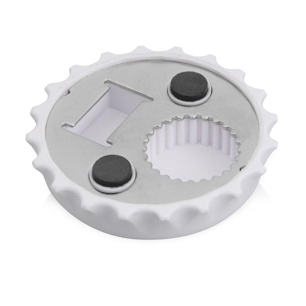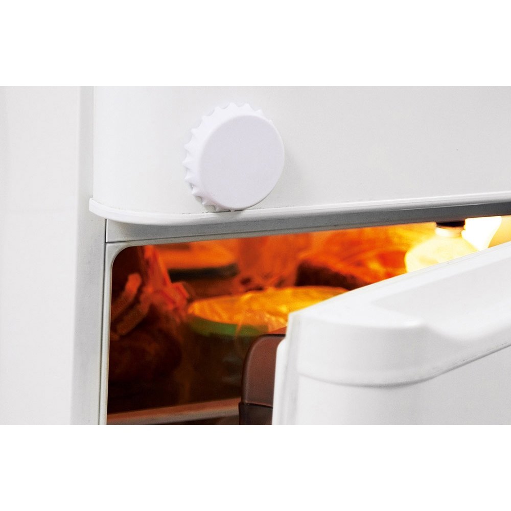 - Открывалка в форме крышки – креативное и удобное приспособление. Вы никогда не потеряете ее, ведь открывалка легко крепится на холодильник двумя магнитами.