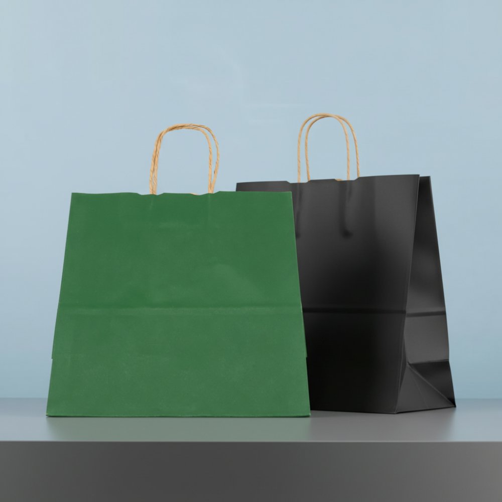 Бумажный пакет плотностью 110 г/м², с усиленными короткими ручками витой формы.