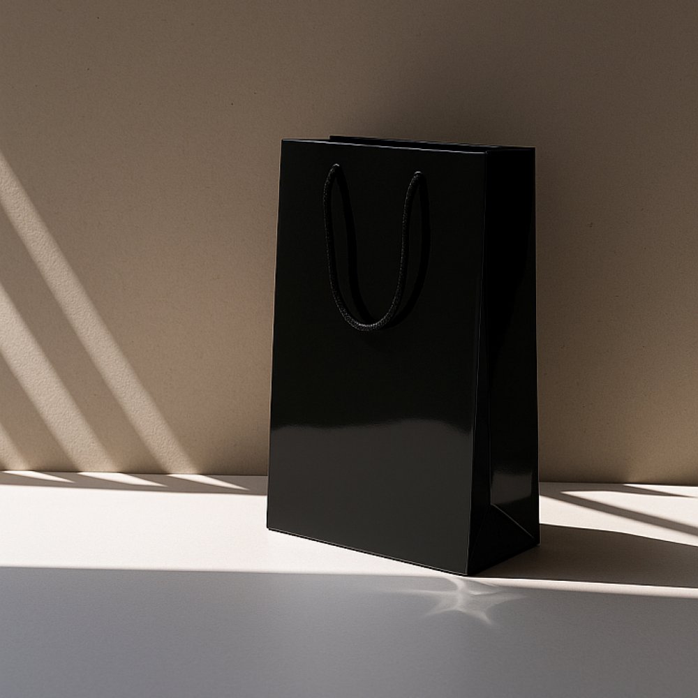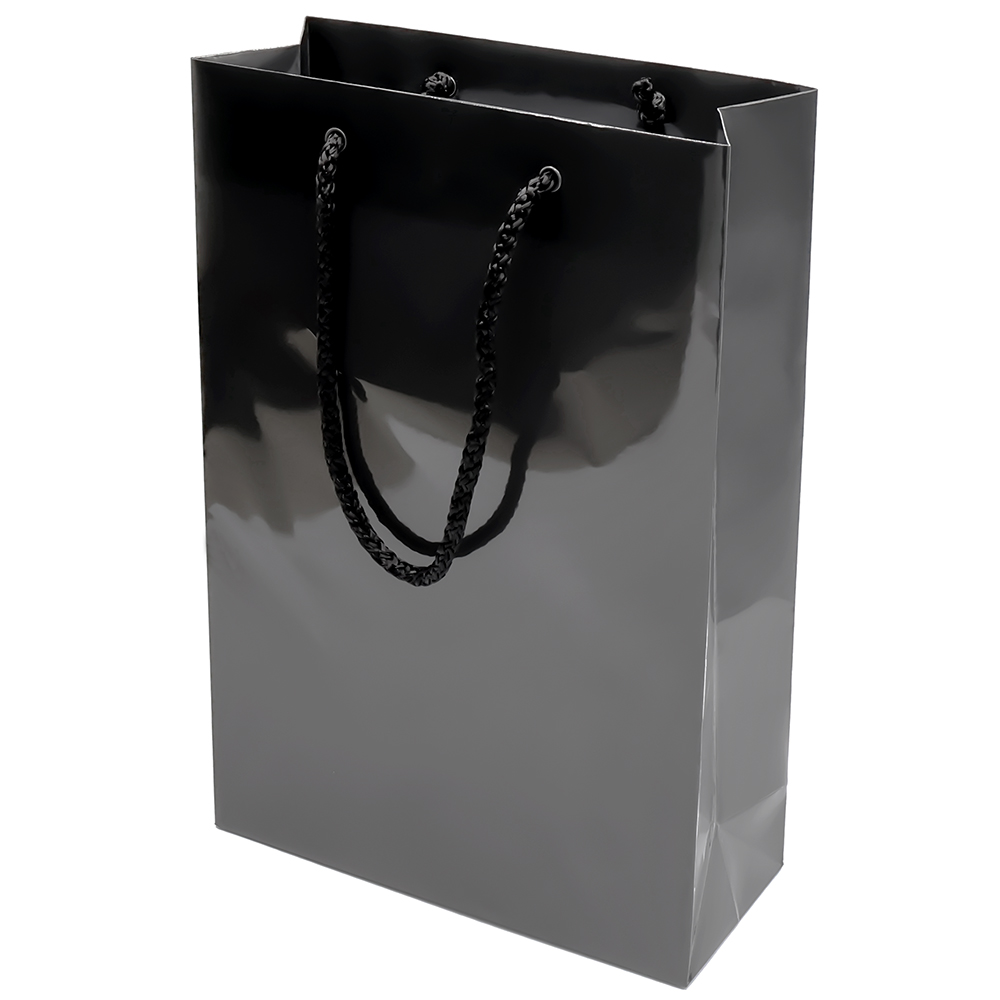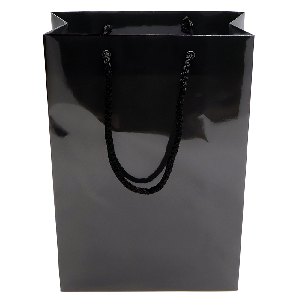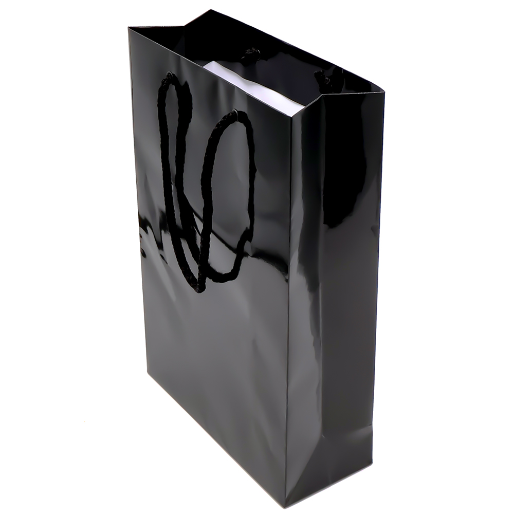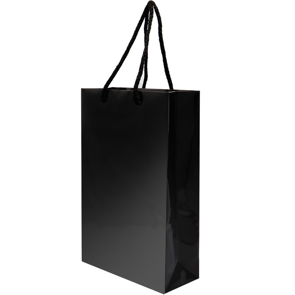 - Бумажный пакет плотностью 170 г/м² с глянцевой ламинацией. Шнур 6 мм черного цвета. Люверс - черный.