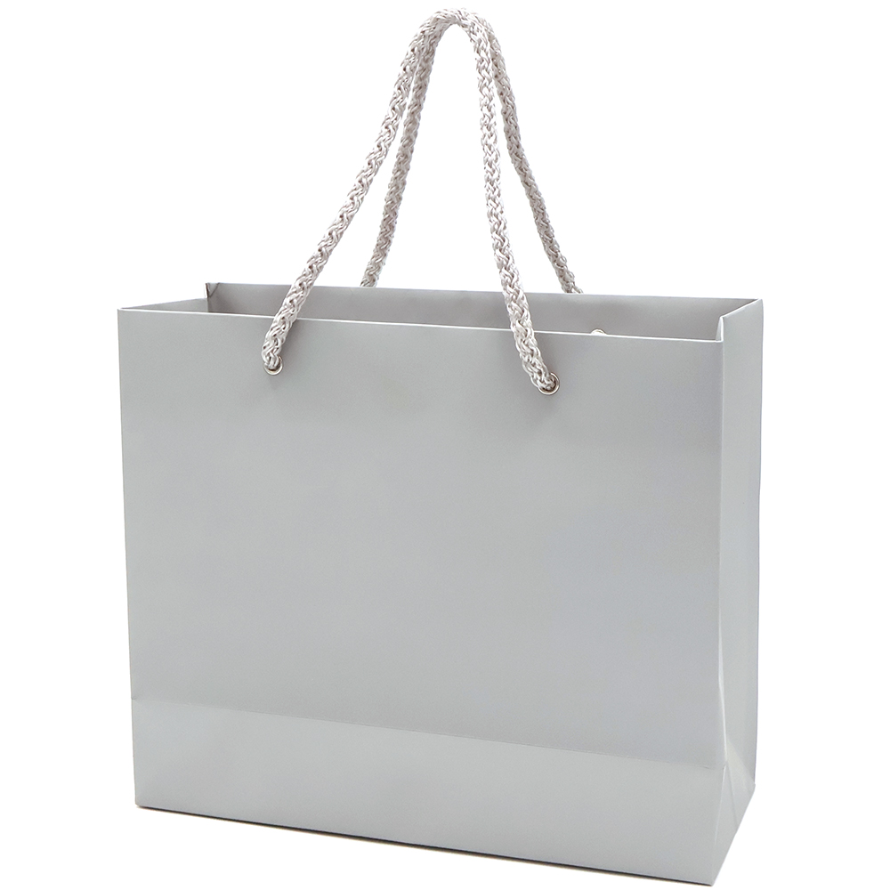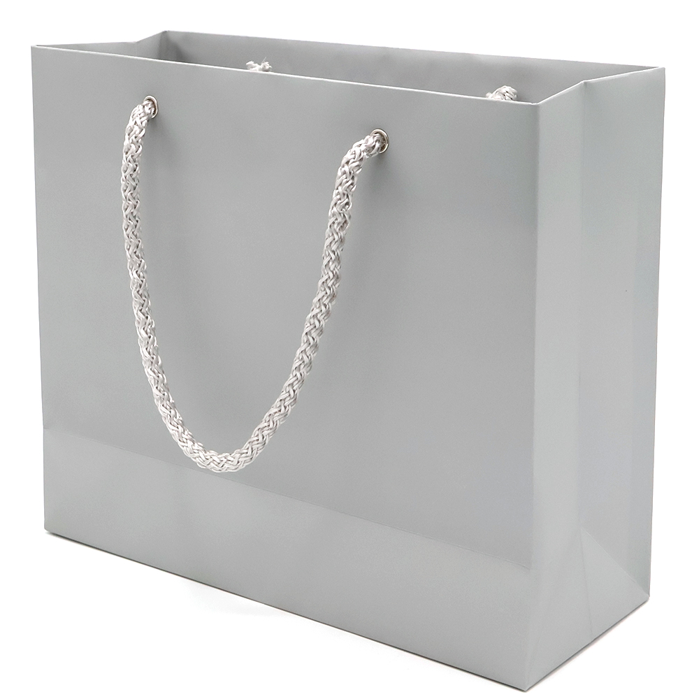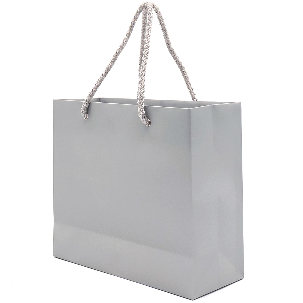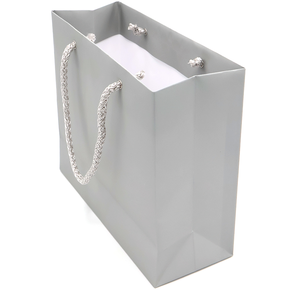 - Бумажный цветной пакет плотностью 170 г/м². Покрытие софт-тач. Шнур 6 мм серого цвета. Люверс - серебристый.