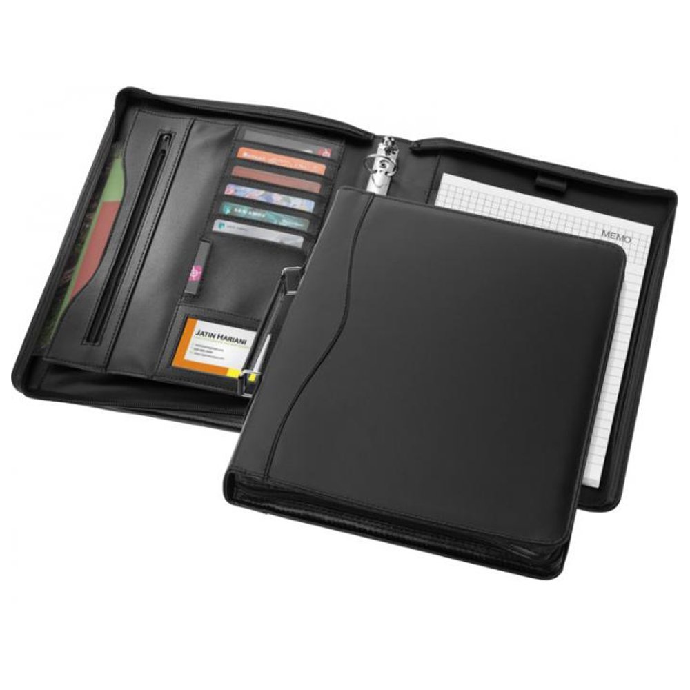 - Папка с ручкой, застежкой-молнией, регистратором, карманом на молнии и отделениями для документов. Включает блокнот А4 с 20 страницами линованной бумаги. Ручка и принадлежности не включены.