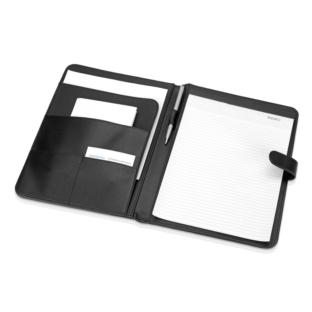 - Строгая деловая папка для документов прекрасно подойдет для классического офисного стиля. Карманы для документов и визиток, сменный блокнот, держатель для ручки. Кнопочная застежка. Плотная обложка из кожзаменителя. Возможна персонализация: тиснение или шильд.
