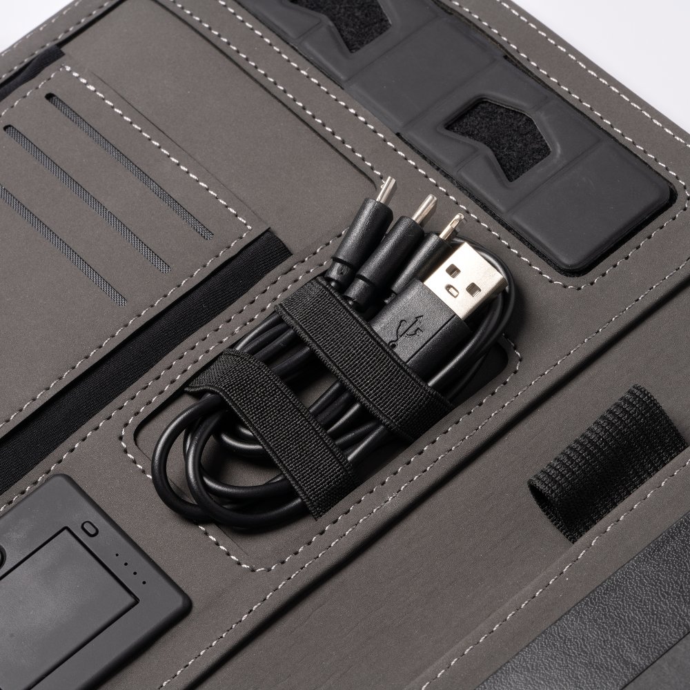 - Многофункциональная папка формата А5 RPET 300D — универсальный и практичный аксессуар, позволяющий систематизировать документы. Магнитный замок, беспроводная зарядка, съемный блокнот на 56 листов, кармашек для мобильного, держатель для карт, ручек и мобильного. Кроме того, в комплект входит кабель с 3 входами (тип C и выход USB)