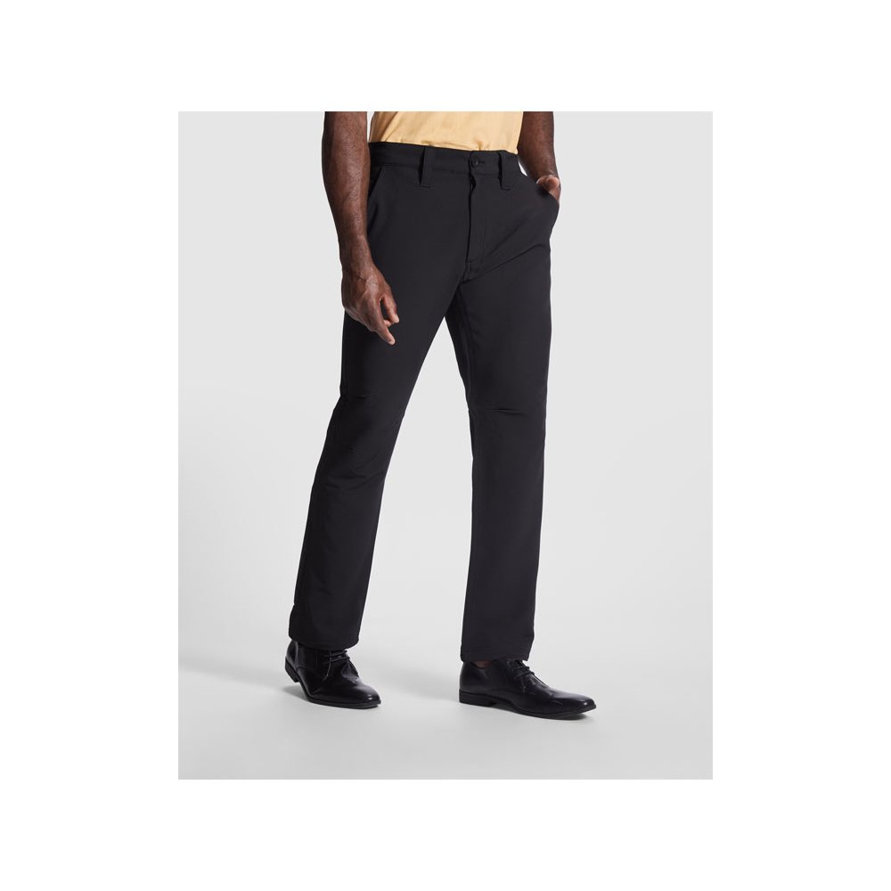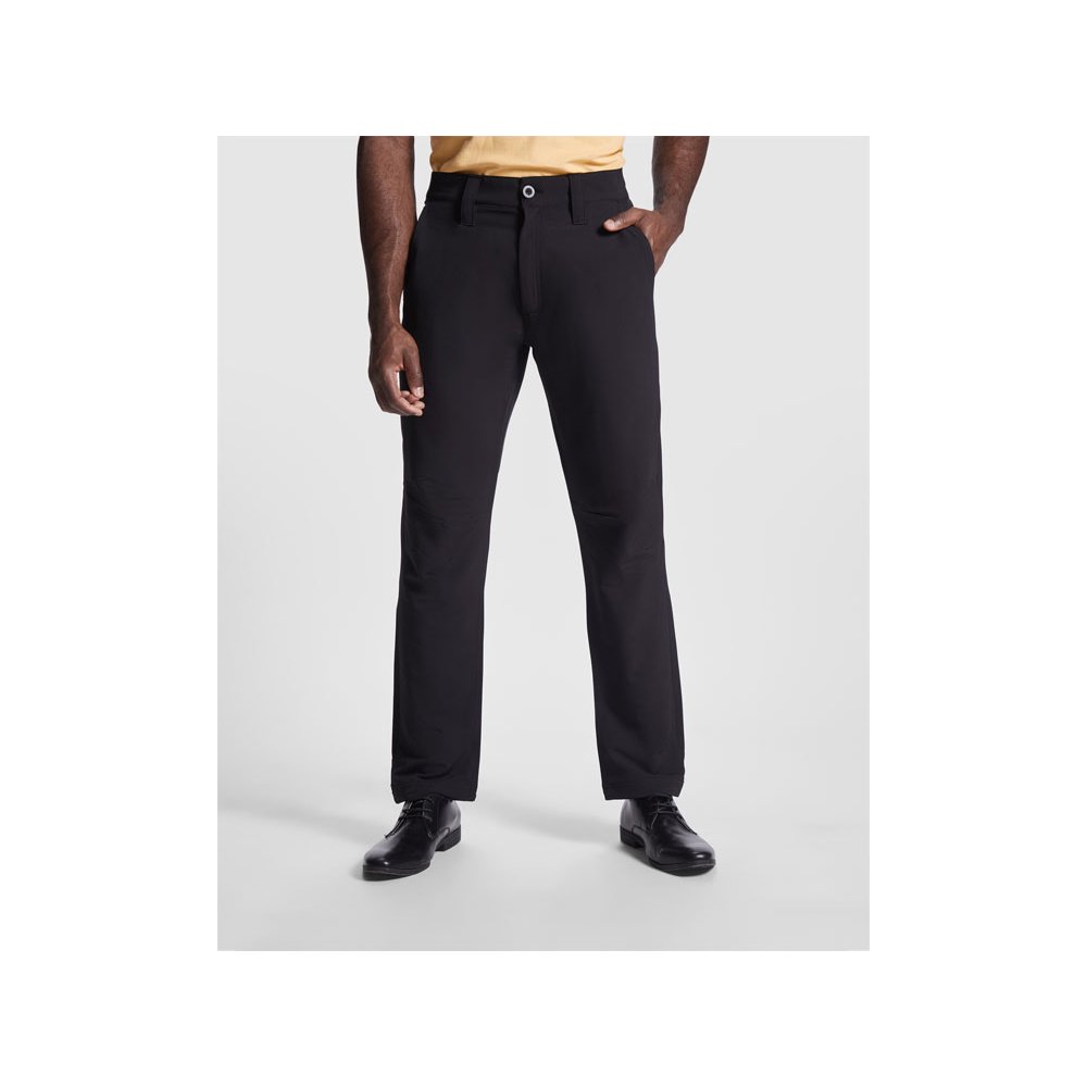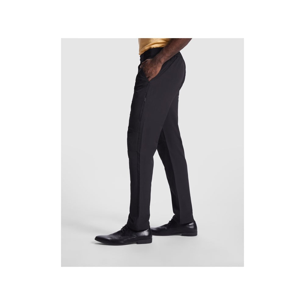 - Длинные брюки унисекс из техничной ткани. - Регулируемый эластичный пояс. - Шлевки. - Два боковых наклонных кармана. - Два боковых кармана в швах на потайных молниях. - Задний карман на кнопке. - Защипы на коленях. - Двойной шов на внутренней стороне штанин, шаговом шве и подгибе низа. - Пластиковые регуляторы с эластичной резинкой по низу.
