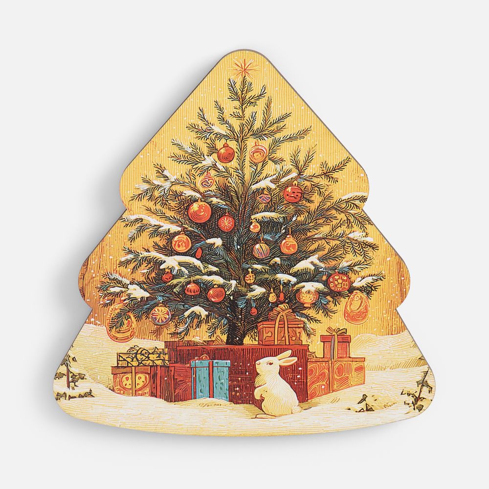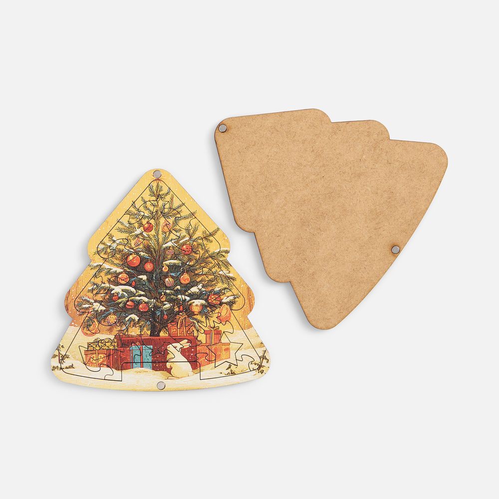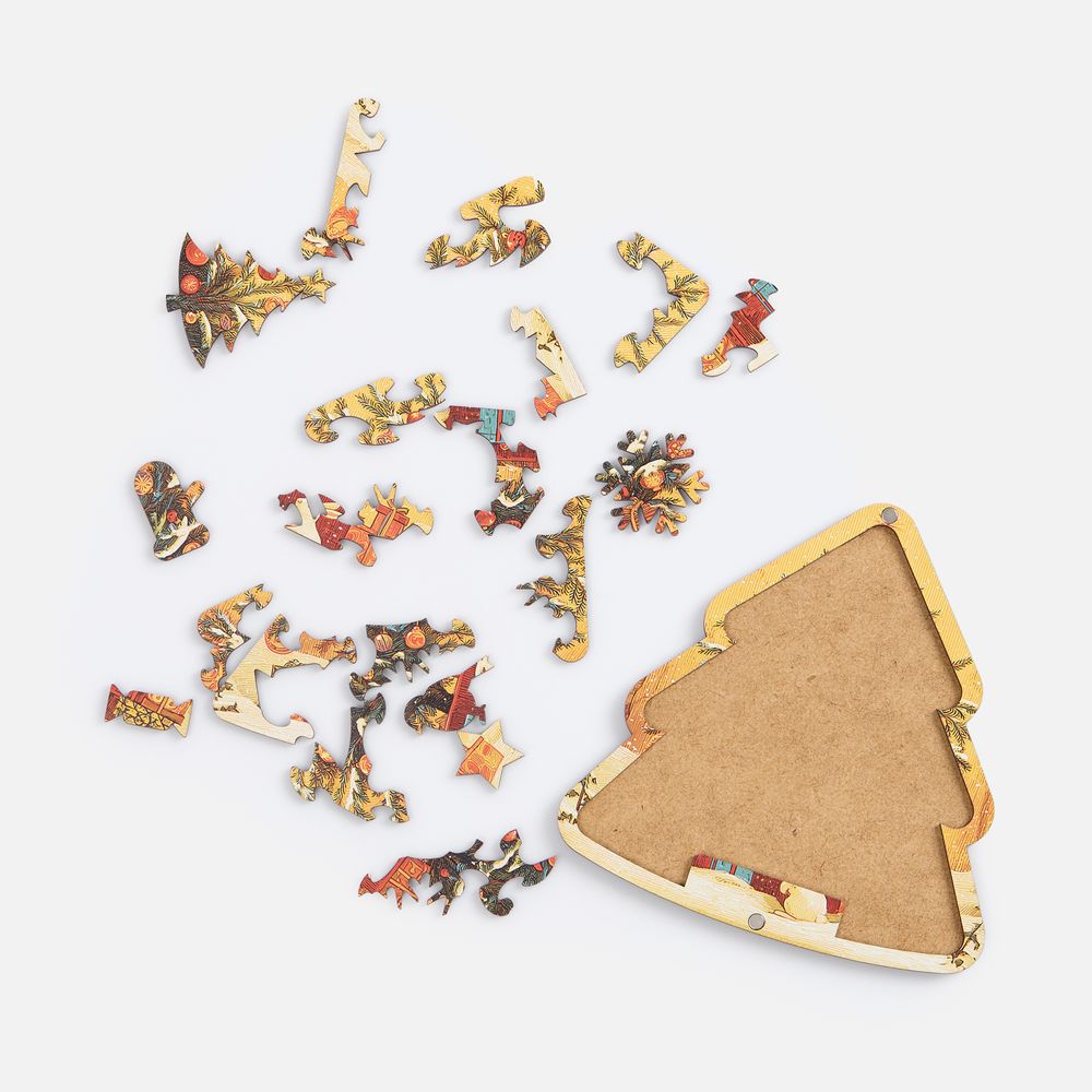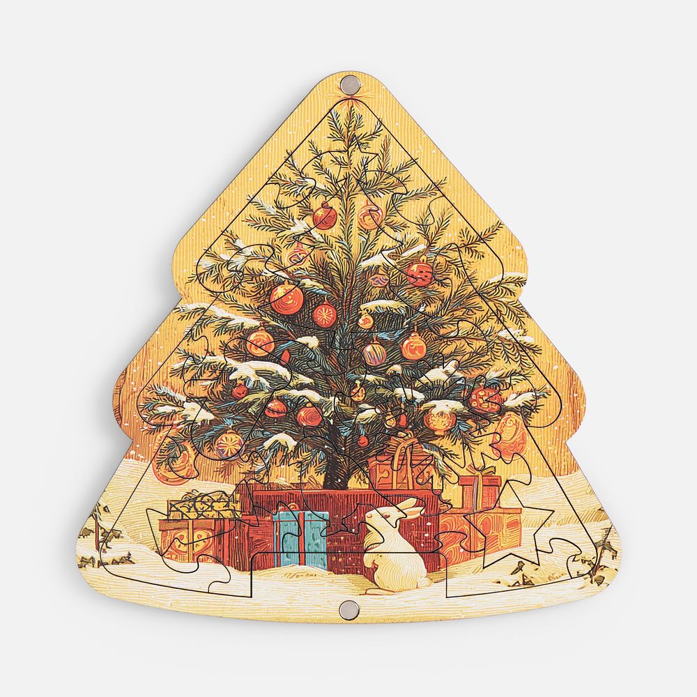 - Очаровательный пазл в форме елочки — воплощение новогоднего уюта и тепла. Идеально украшенная елка в окружении подарков на фоне заснеженного пейзажа — просто сама гармония праздника. Такой стиль классической новогодней открытки подарит особое настроение и предвкушение волшебства!