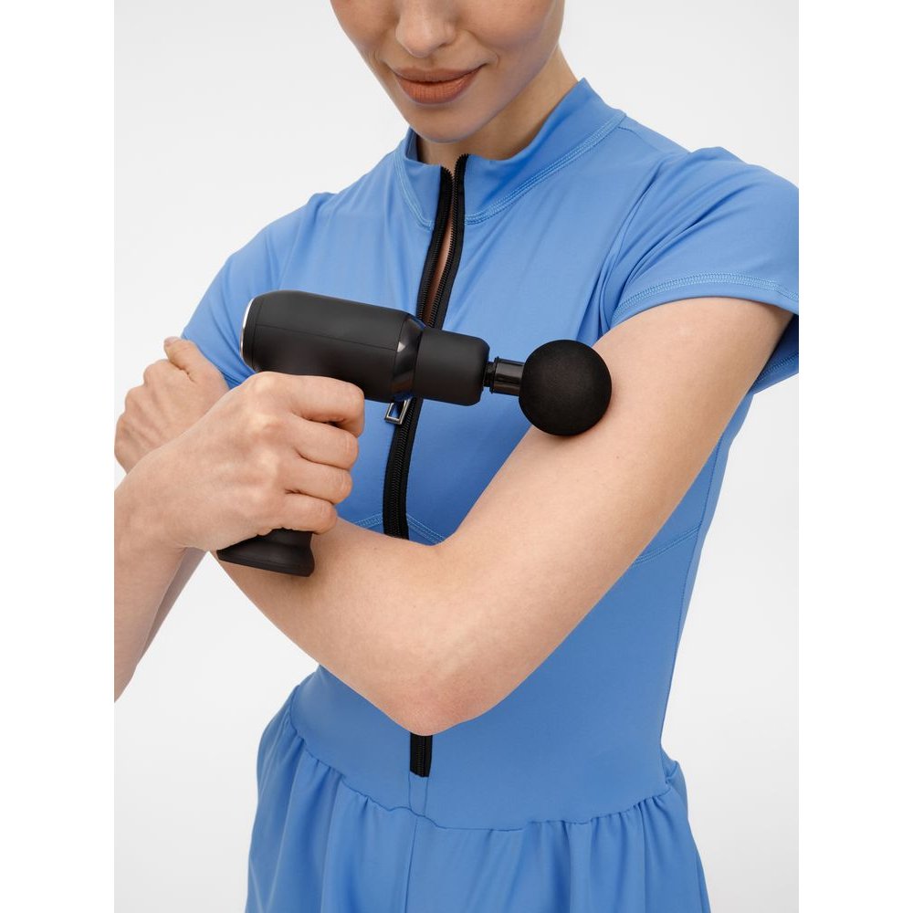 Конструкция массажера выполнена в форме мини-пистолета с тактильно приятным матовыми покрытием и эргономичной ручкой — его удобно держать в руке, а простая система управления при помощи кнопок делает его использование комфортным и понятным.