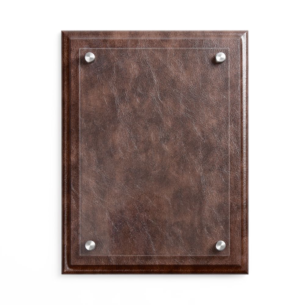 - Классическая плакетка с имитирующей кожаную текстуру основой и акриловой вставкой — универсальный инструмент, чтобы рассказать о достижениях команды.