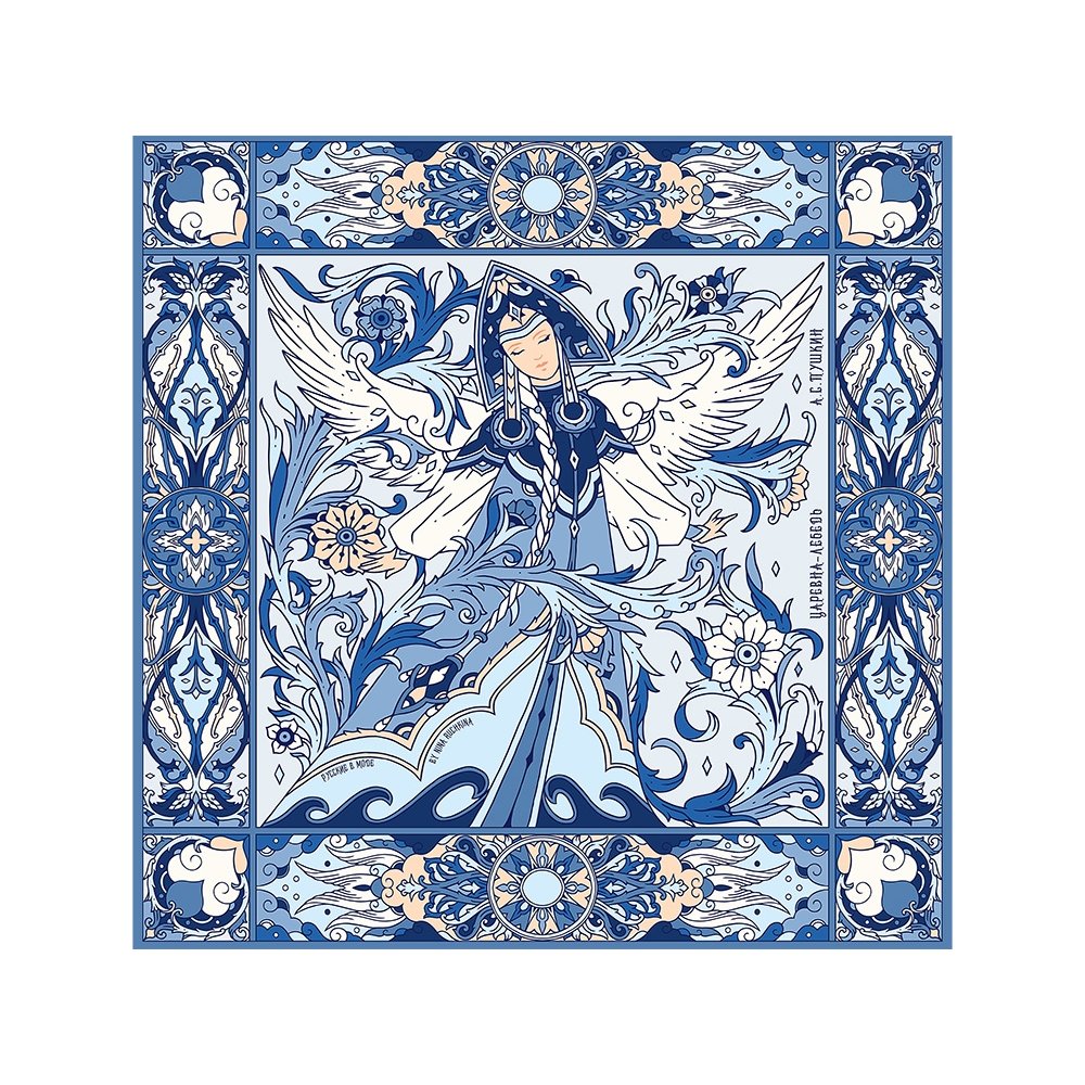 - Дизайнерский платок «Царевна Лебедь» от Нины Ручкиной стал воплощением сказочного персонажа, прославленного великим и талантливым романтиком и поэтом — А. С. Пушкиным. Именно он впервые подарил нам образцы художественной русской эстетики, исходящей из самой глубины русской души. В центре авторского принта — удивительной красоты женщина с белоснежными крыльями, наделенная магическими способностями и житейской мудростью. Оригинальное сочетание тонов, цветочных орнаментов и русского колорита делают аксессуар нежным и самобытным. Платок с прекрасной Царевной Лебедь подойдет изящным и романтичным натурам, предпочитающим классику и традиционный русский стиль. Он станет деликатным дополнением как повседневного, так и вечернего образа утонченной леди. Над дизайном работали художники: Нина Ручкина, Мила Лосенко.