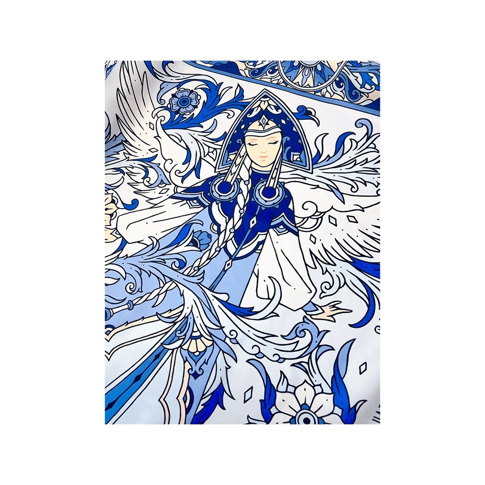 В центре авторского принта — удивительной красоты женщина с белоснежными крыльями, наделенная магическими способностями и житейской мудростью. Оригинальное сочетание тонов, цветочных орнаментов и русского колорита делают аксессуар нежным и самобытным.