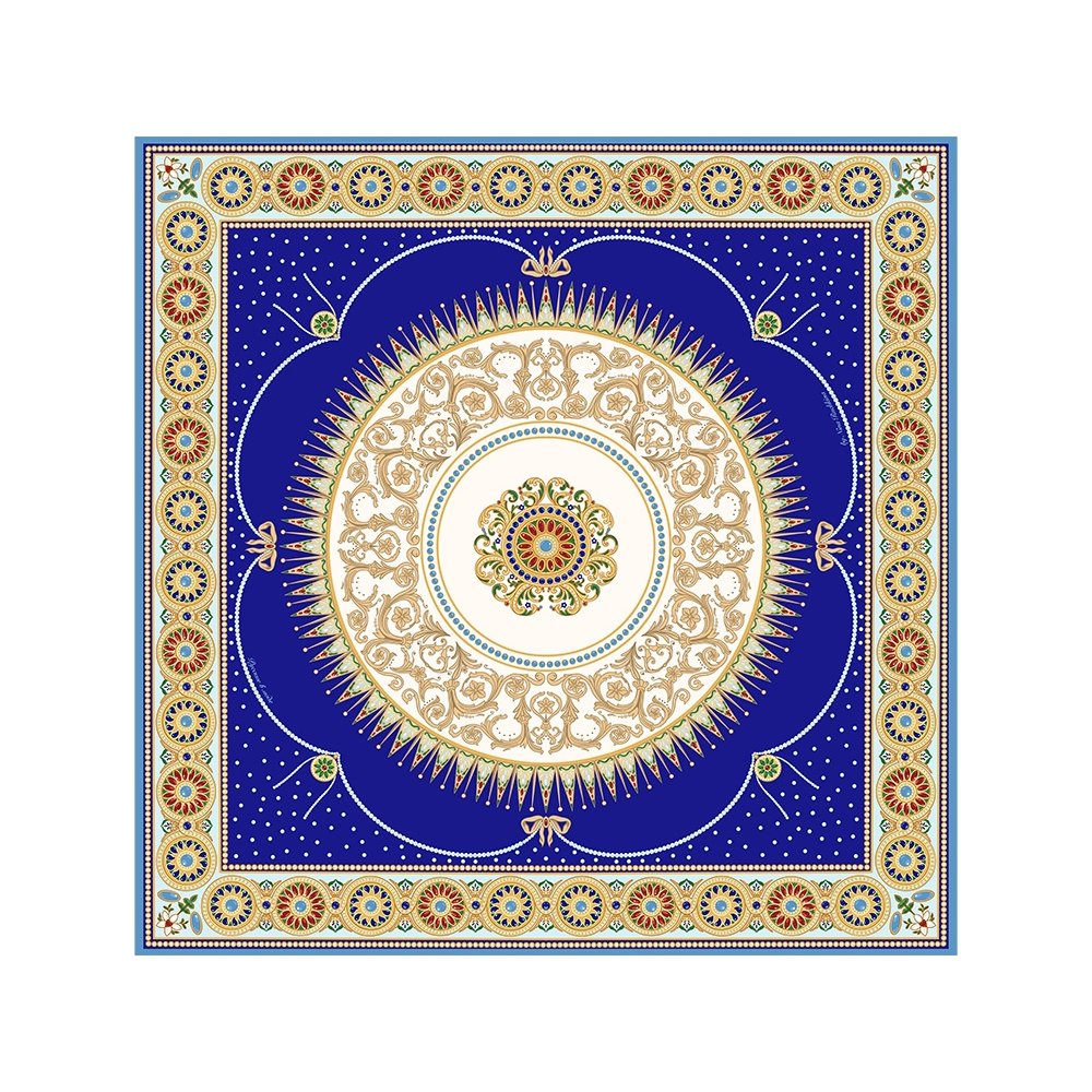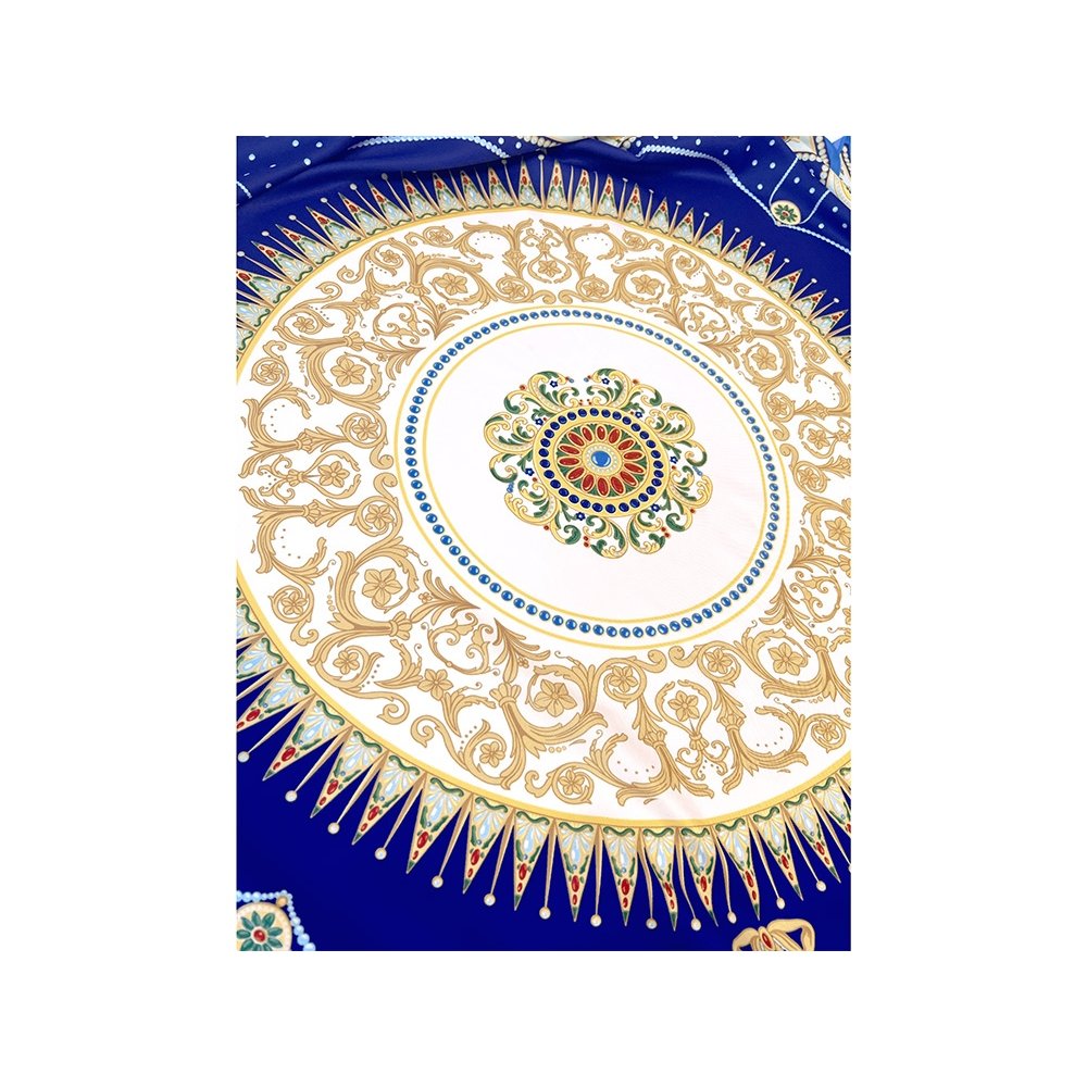 В центре полотна размещен изящный медальон, повторяющий оригинальный рисунок севрского фарфора, выполненного в ювелирной технике накладных эмалей и словно украшенного россыпью драгоценных камней. Цветовой строй воспроизводит парадную эстетику дворцового фарфора, где глубокий королевский синий в сочетании с золочёным орнаментом образуют гармоничное звучание.