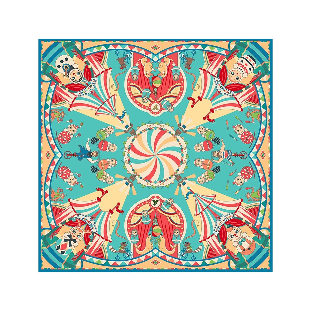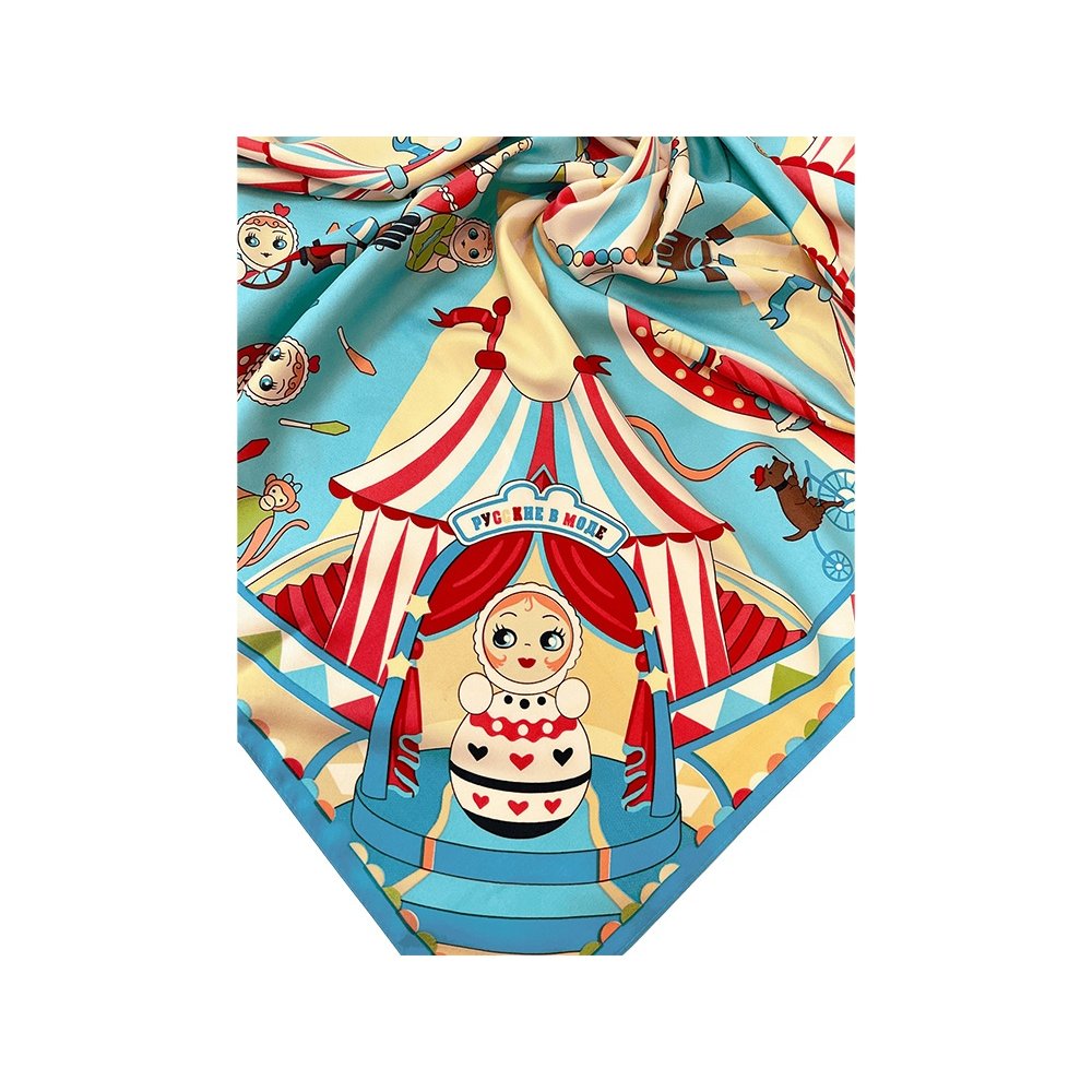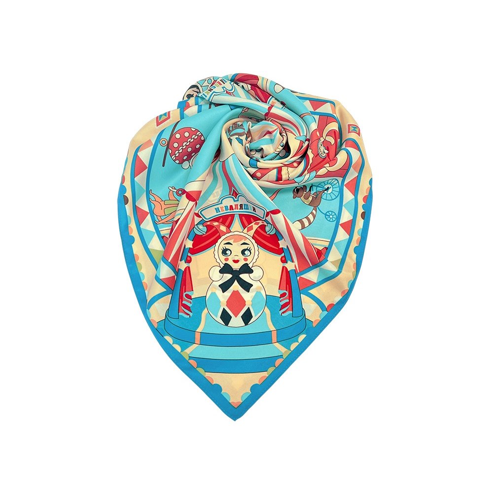 - Яркая неваляшка – символ России – неизменно возвращает нас в мир детства, радости и безграничного оптимизма. Знаменитая игрушка стала метафорой, олицетворяющей стойкий русский характер, в котором несгибаемая сила духа сочетается с гостеприимством и радушием. На полотне воплощена добрая атмосфера народного веселья и волшебства, где каждый рисунок напомнит о сказках, ярмарках и лубочных иллюстрациях. В центре лучится купол цирка, разноцветный словно леденец, а вокруг раскинулись нарядные шатры. В свете софитов запечатлены расписные образы игрушек, зверей, эквилибристов и силачей – уникальные и неповторимые, они образуют кружащийся танец. Прикоснитесь к традициям России вместе с изысканным платком «Русская неваляшка. Праздник», который подчеркнет Вашу индивидуальность, поднимет настроение или станет ценным подарком! Над дизайном работали: Нина Ручкина, Ирина Цыбина, Анна Тумашова.