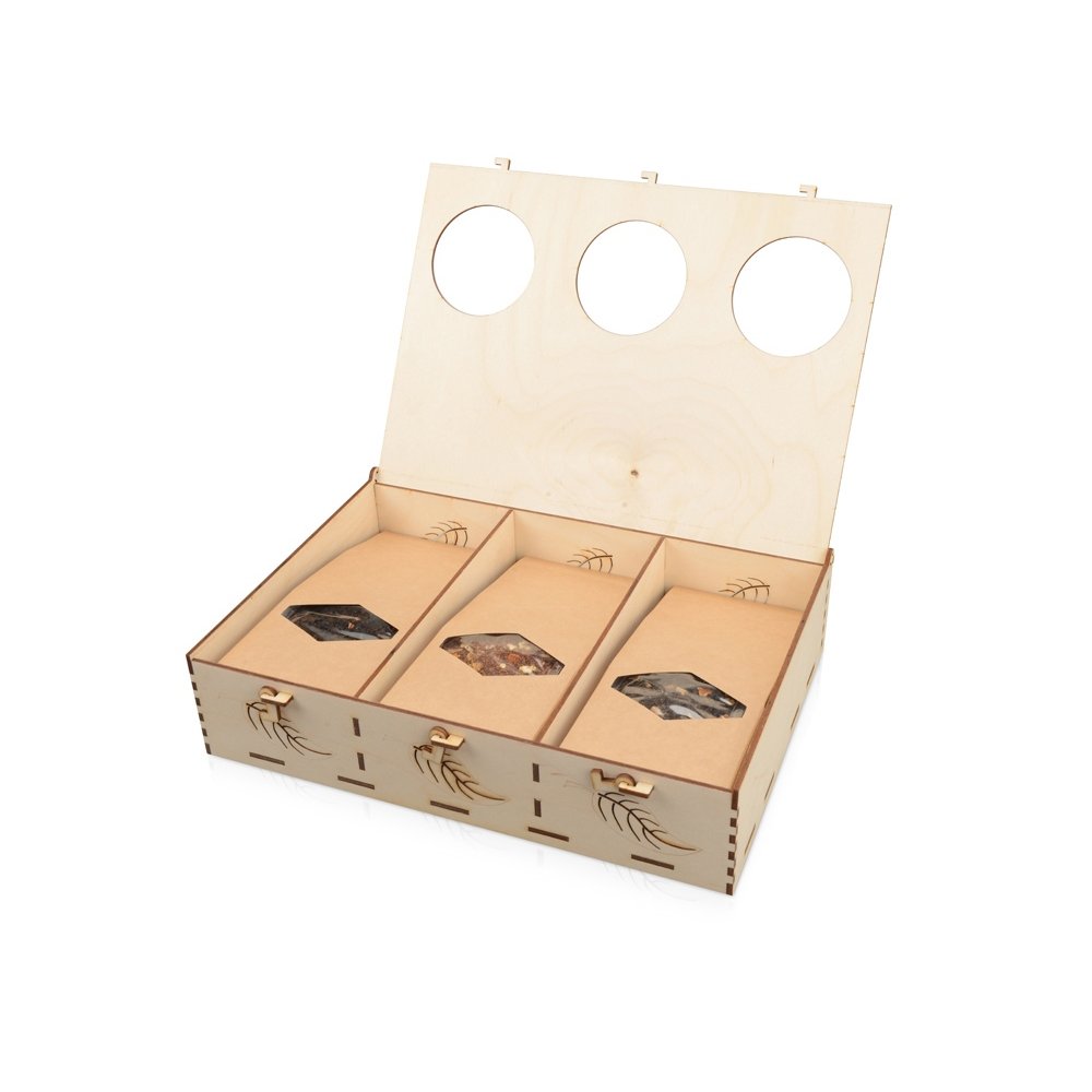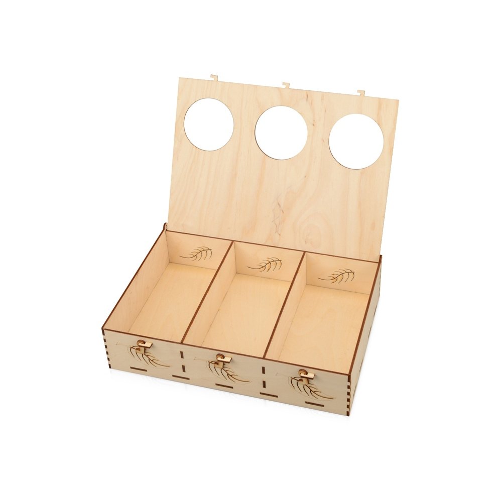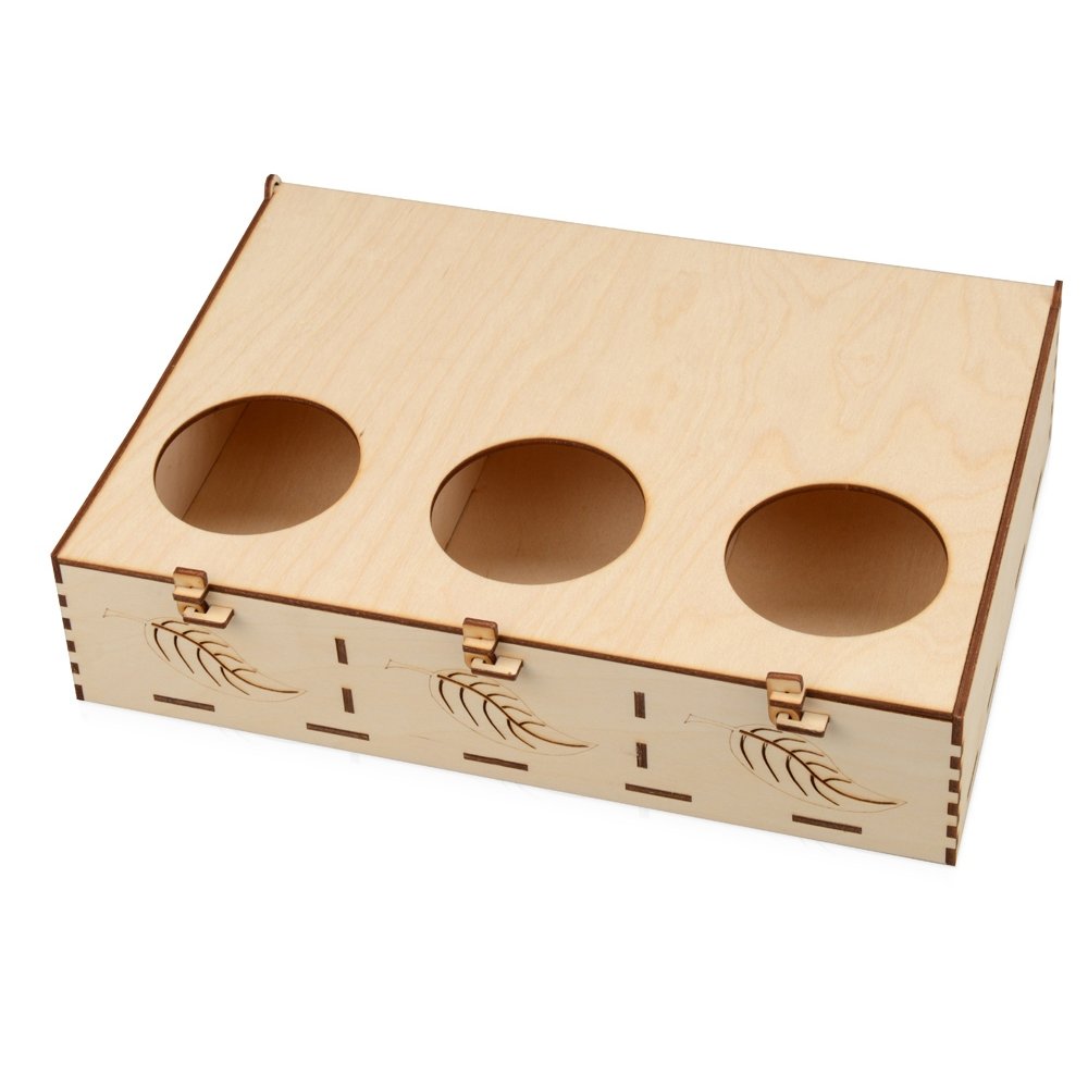 - Подарочная коробка из трех секций, украшенная экопринтом в виде листа растения. В крышке над каждой из секций есть отверстие, чтобы можно было рассмотреть содержимое. Коробка выполнена из березовой фанеры и отлично гармонирует с наполнителем из крафтовой бумаги. Хотите нестандартно украсить подарок? Упакуйте его в подарочную коробку «Лист», она сохранит его содержимое в целости и сохранности.