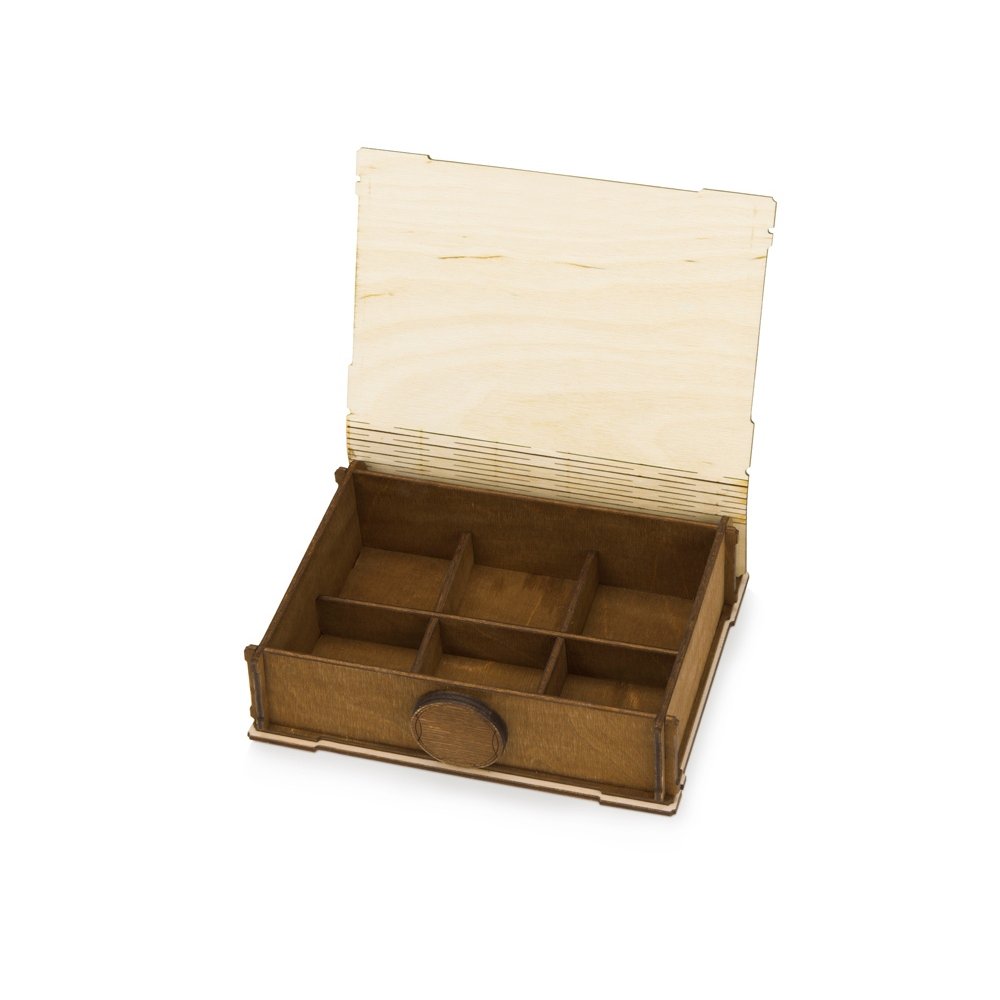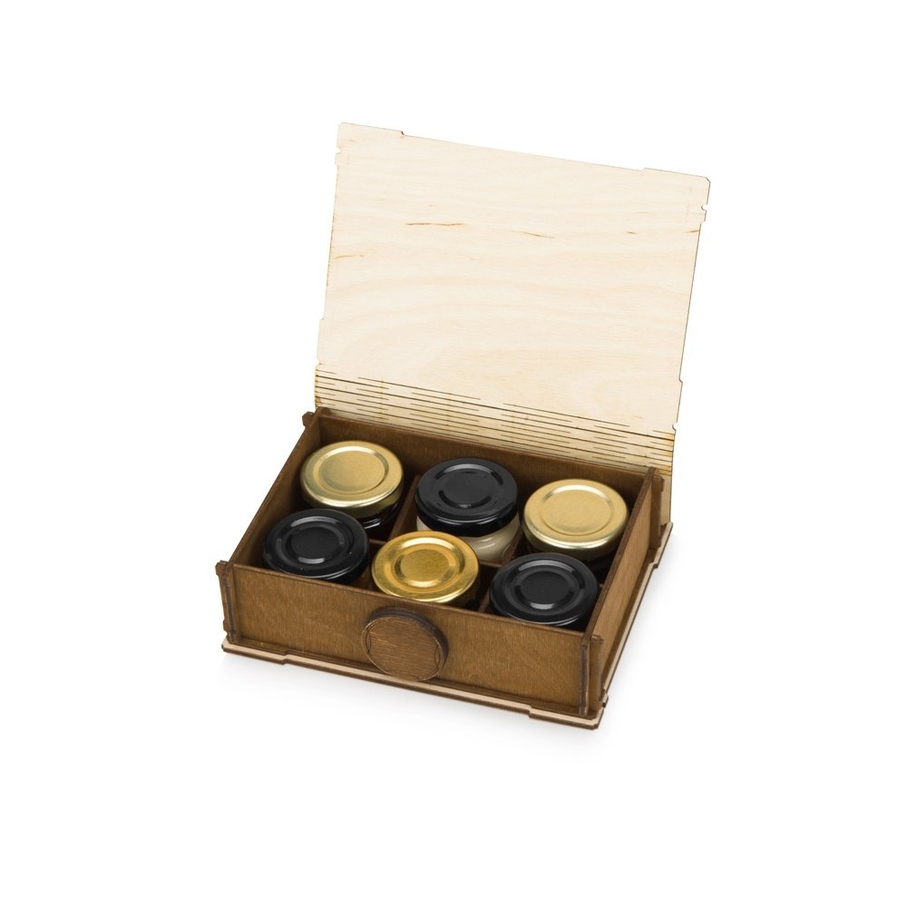- Подарочная коробка «Тайна» - это шести секционная деревянная коробка, в которой сувениры надежно фиксируются с помощью крышки и резинки. Коробка изготовлена из экологически чистых материалов - березовой фанеры. Внутри упаковки находится деревянная перегородка, которая легко убирается и тогда коробка становится настоящей шкатулкой для ювелирных изделий, бижутерии, косметики, часов, а также подойдет для хранения различных товаров рукоделия: пуговиц, бисера, ниток, лент, тесьмы и др. Форма, материал и стильное исполнение подарка позволяет занять ему достойное место в интерьере офиса, дома или дачи. На крышке коробки можно сделать нанесение вашего логотипа или промо информации с пожеланиями, тем самым подчеркнуть эстетическую значимость презента. Содержимое подарочной упаковки можно наполнить баночками с вареньем и медом из нашего каталога.
