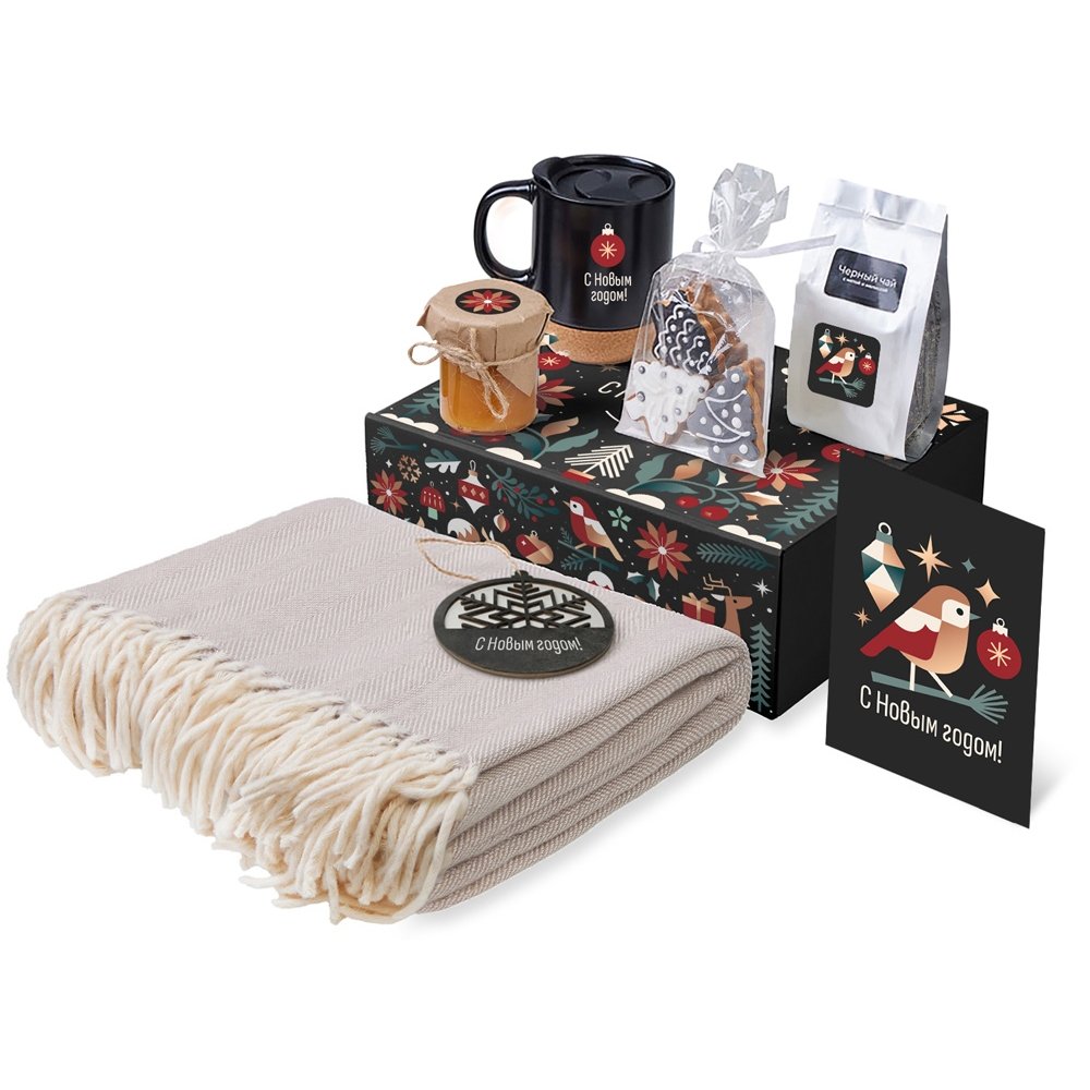- Плед 100% хлопок; кружка керамика/пробка; подвеска дерево; открытка бумага
