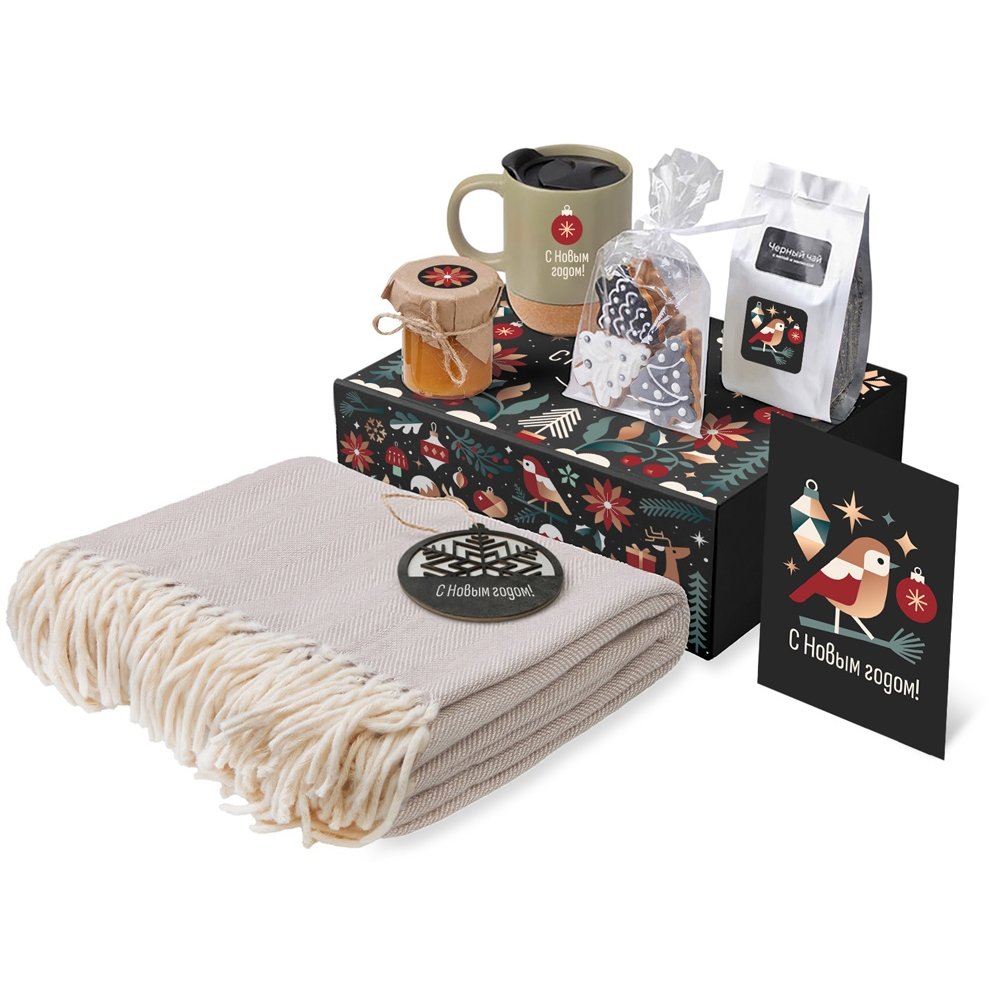 - Плед 100% хлопок; кружка керамика/пробка; подвеска дерево; открытка бумага