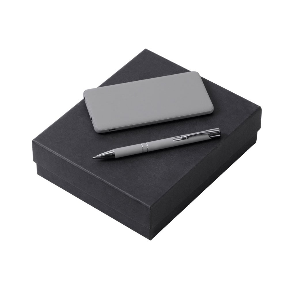 - Повербанк пластик с покрытием soft touch/ручка алюминий с покрытием soft touch/коробка картон переплетный 1,5 мм/дизайнерская бумага/ложемент поролон.
