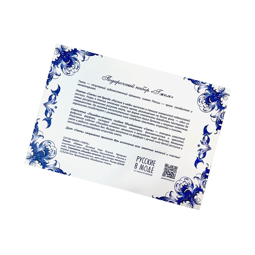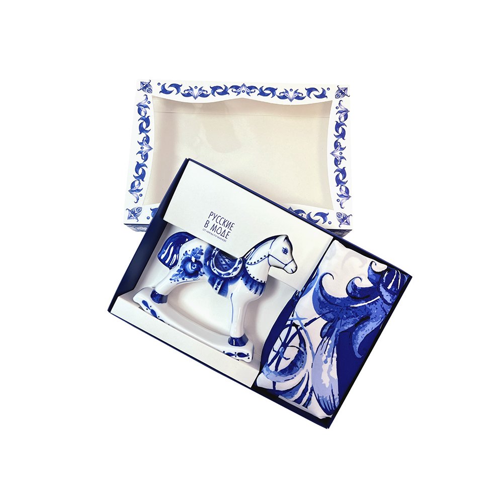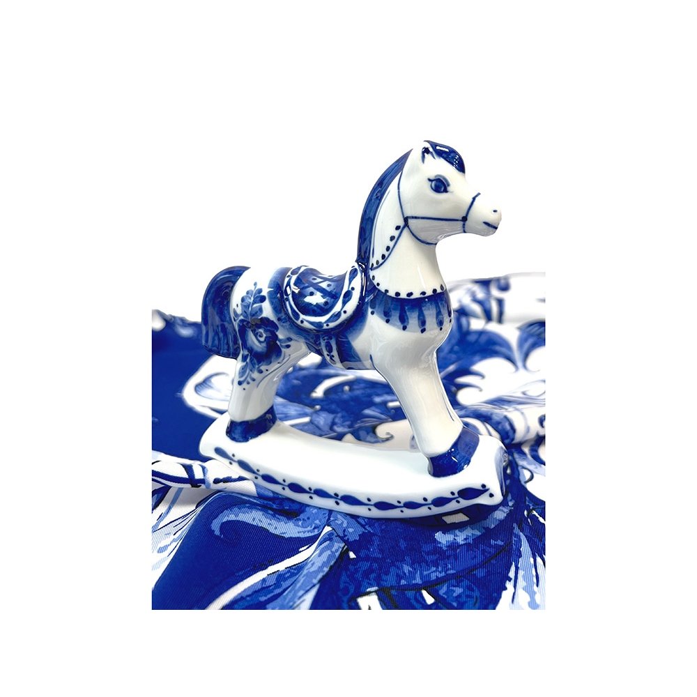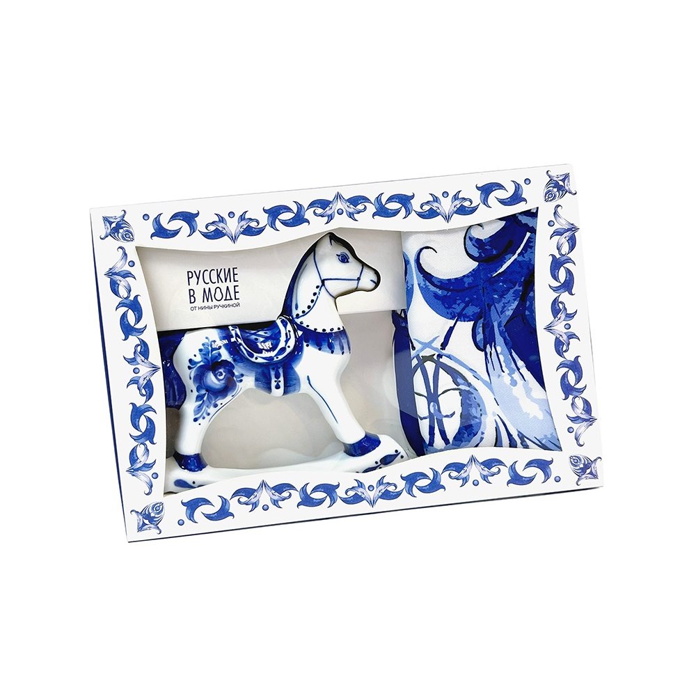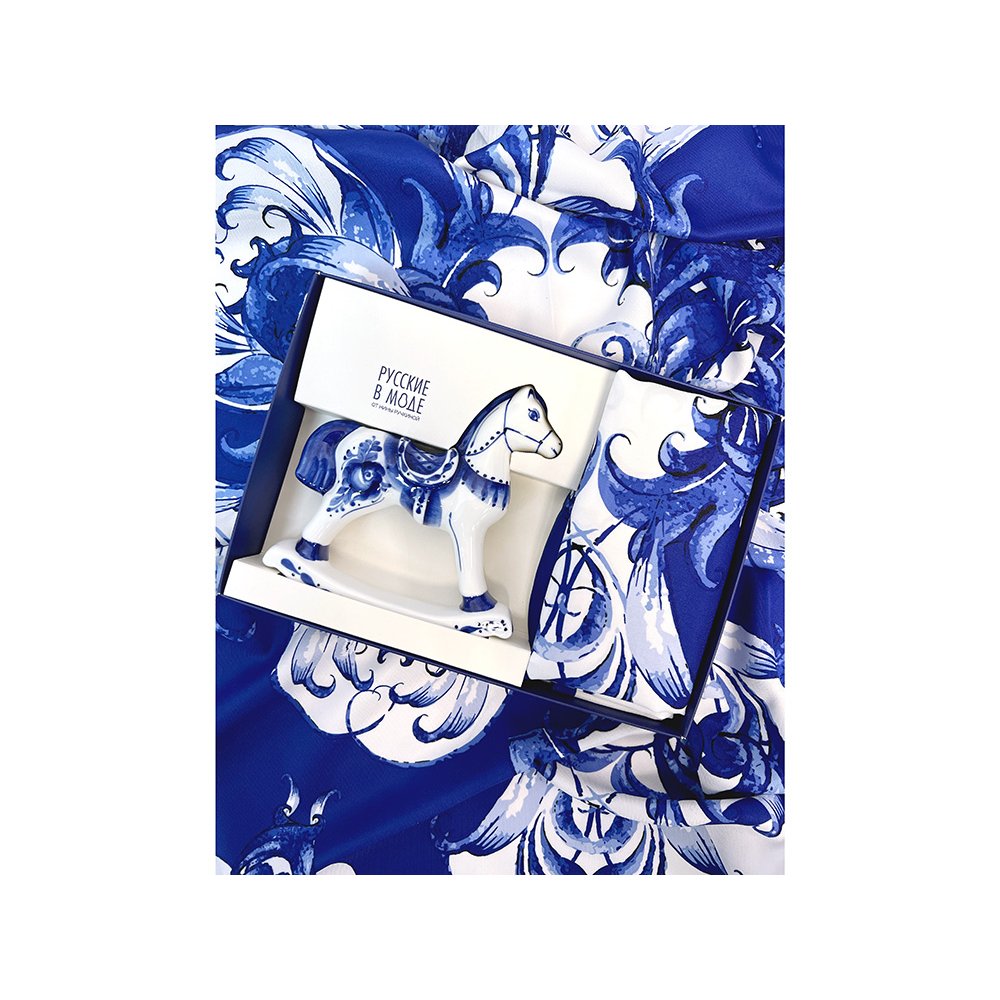 - Гжель — популярный художественный промысел, символ России — яркая, самобытная и неповторимая. Платок «Гжель» от бренда «Русские в моде» выполнен в технике знаменитой кобальтовой росписи. Узоры в тонких оттенках синего цвета, размещенные на белом фоне, — один из самых распространенных рисунков гжель, чья форма столетиями доводилась мастерами до совершенства. На полотне восхитительные соцветия тугих бутонов и ажурных лепестков гармонично соседствуют с узнаваемыми сине-голубыми завитками, спиралями и линиями. Статуэтка «Лошадка-качалка» создана Объединением «Гжель» — всемирно известной фабрикой фарфора, который отличается качеством, долговечностью и красотой. Изысканное изделия «Лошадка-качалка» напомнит о волшебном мире детства, домашнем уюте и радости каждого дня. Фигурка выполнена из фарфора с ручной сине-белой росписью и воплощает неповторимое искусство гжели. Дуэт «Гжель» непременно принесет Вам исполнение всех заветных желаний и счастье!